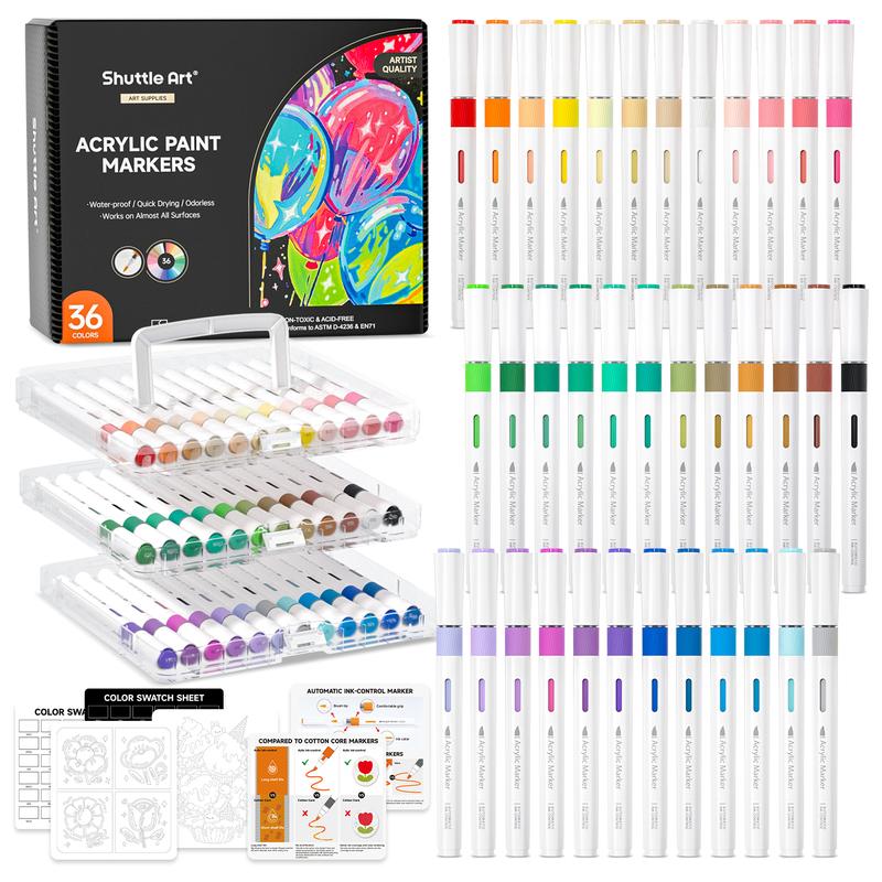 ·【36 Colors & Convenient Accessories】: Shuttle Art acrylic paint markers set comes with 36 vibrant color options to choose from, rich primary and complementary colors, equipped with high-quality ink, waterproof and fade-resistant, perfect for your multi-color needs. The marker set also contains a 3-layer transparent Acrylic Box, 2 color charts and 2 coloring patterns, all for your easy identification and organization when choosing the right color, a hassle-free choice for your creating.