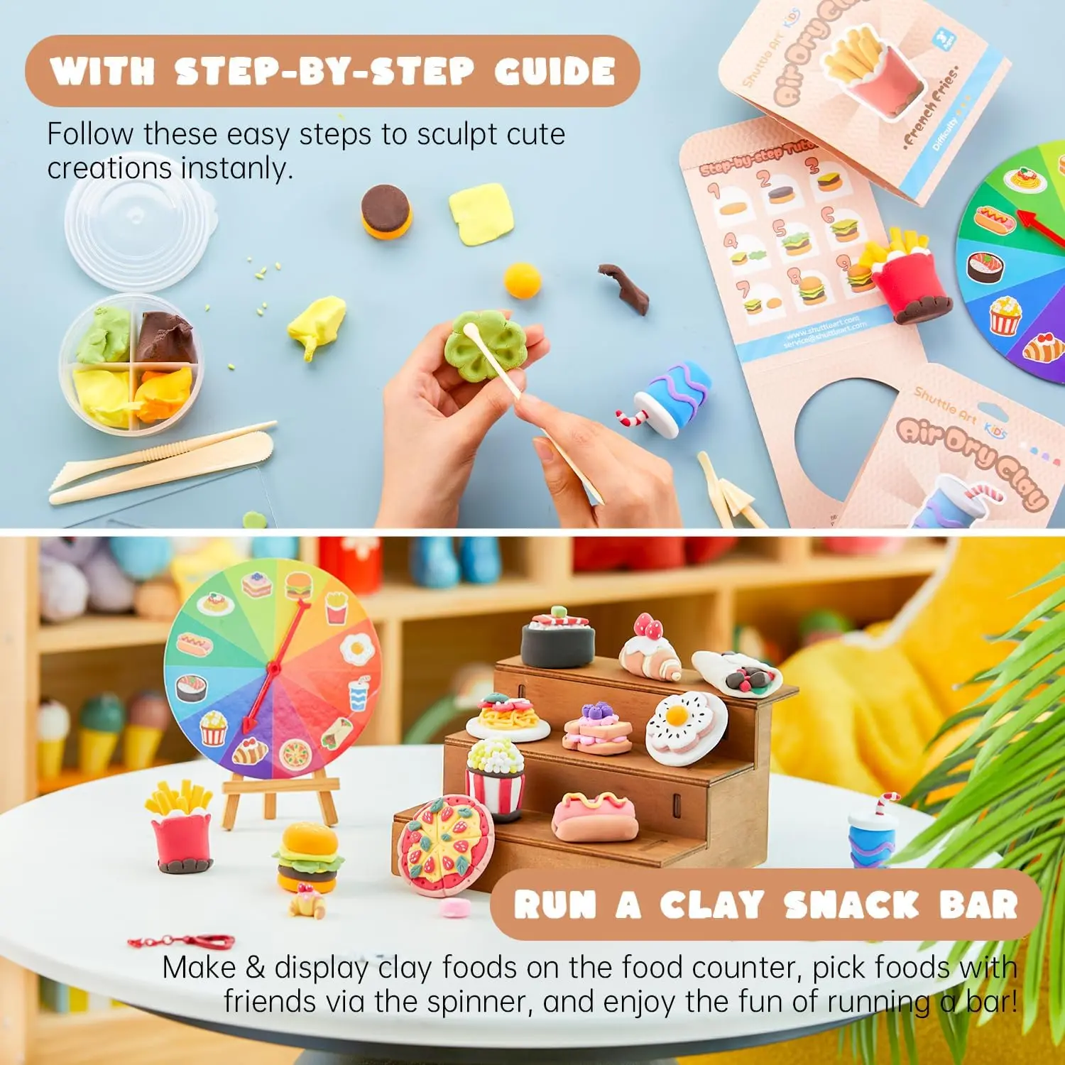 ·33 PCS AIR DRY CLAY KIT:This all-in-one kit includes 12 food-themed clay boxes,each with 4 pre-matched colors. It features rich accessories including step-by-step tutorials, sculpting tools, acrylic sheets, food spinner, keychains, and a wooden food counter —enabling boys and girls to create 12 food figures and enjoy the fun of running a food store