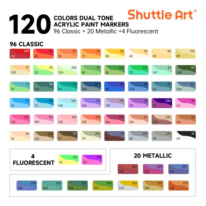 ·【120 Colors & Convenient Accessories】:Shuttle Art 60 pack Dual Tone Acrylic Paint Markers feature 2 different colors in 1 pen —120 total colors (96 classic + 20 metallic + 4 fluorescent). With so much colors, you can almost complete all of your daily creations. The set also includes 5 coloring patterns, 2 color charts, a color sticker, a marker journal and a portable box, all for your easy identification and organization when choosing the right color, a hassle-free choice for your creating.
