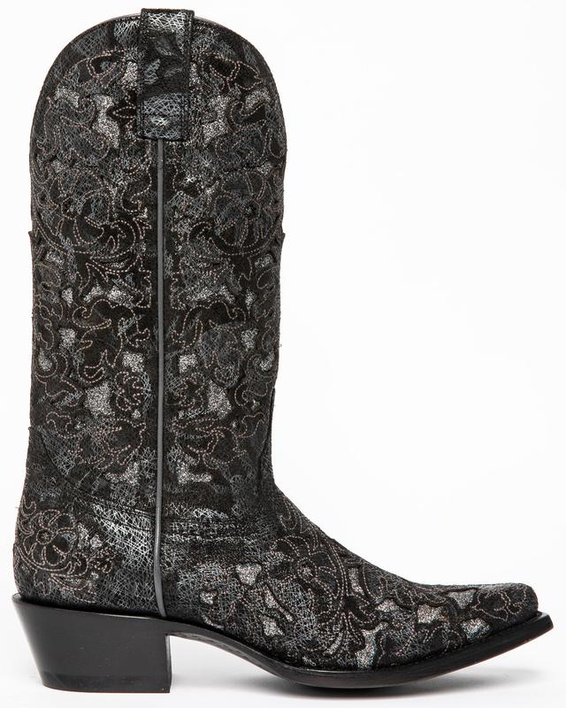 Full-grain leather. 12" shaft. Snip toe. Leather lining. Leather outsole. Allover inlay design. Western heel. Handcrafted by highly skilled boot artisans.
