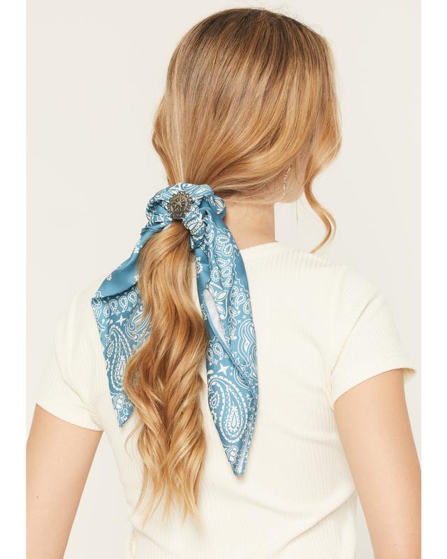 One size fits most. Pack includes 2 scrunchies. Hair tie 1: Blue with white bandana print. Hair tie 2: Brown with white bandana print. Ribbon details. Silver-toned concho accent with painted details. Imported.