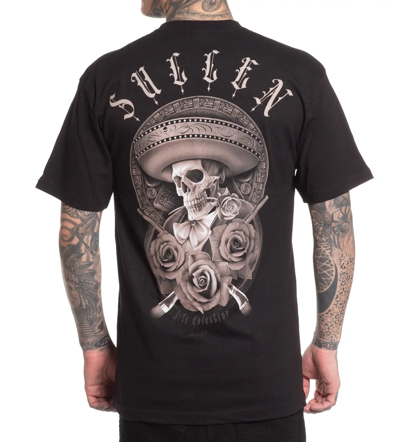 Sullen Clothing Sicarios Standard Tshirt Menswear Cotton Jersey Tee with Roses & Mariachi Skull Design Cultural Streetwear Top