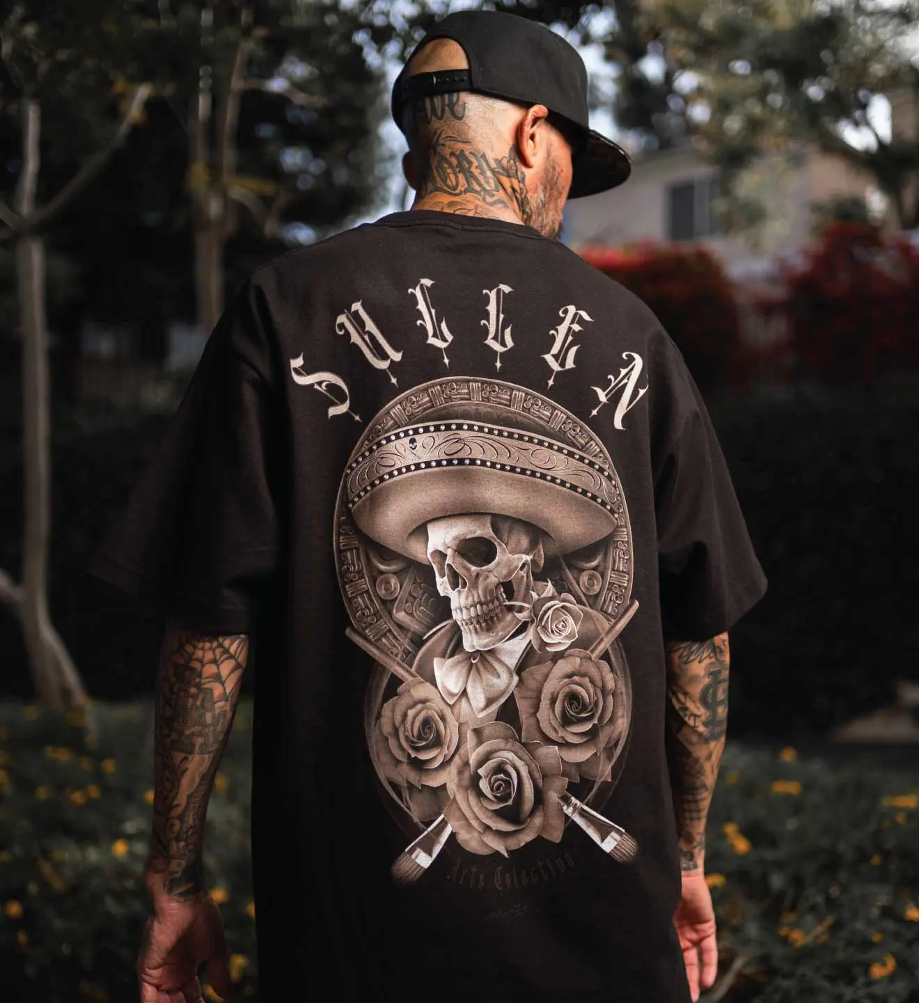Rocking a clean monochrome palette, Sicarios features a skeletal mariachi with a stare that cuts deep. Framed with roses and crossed paint brushes—repping both culture and creativity. It’s a tribute to the soul of the artist and the spirit of the streets, brought to you on our classic black Standard tee.
