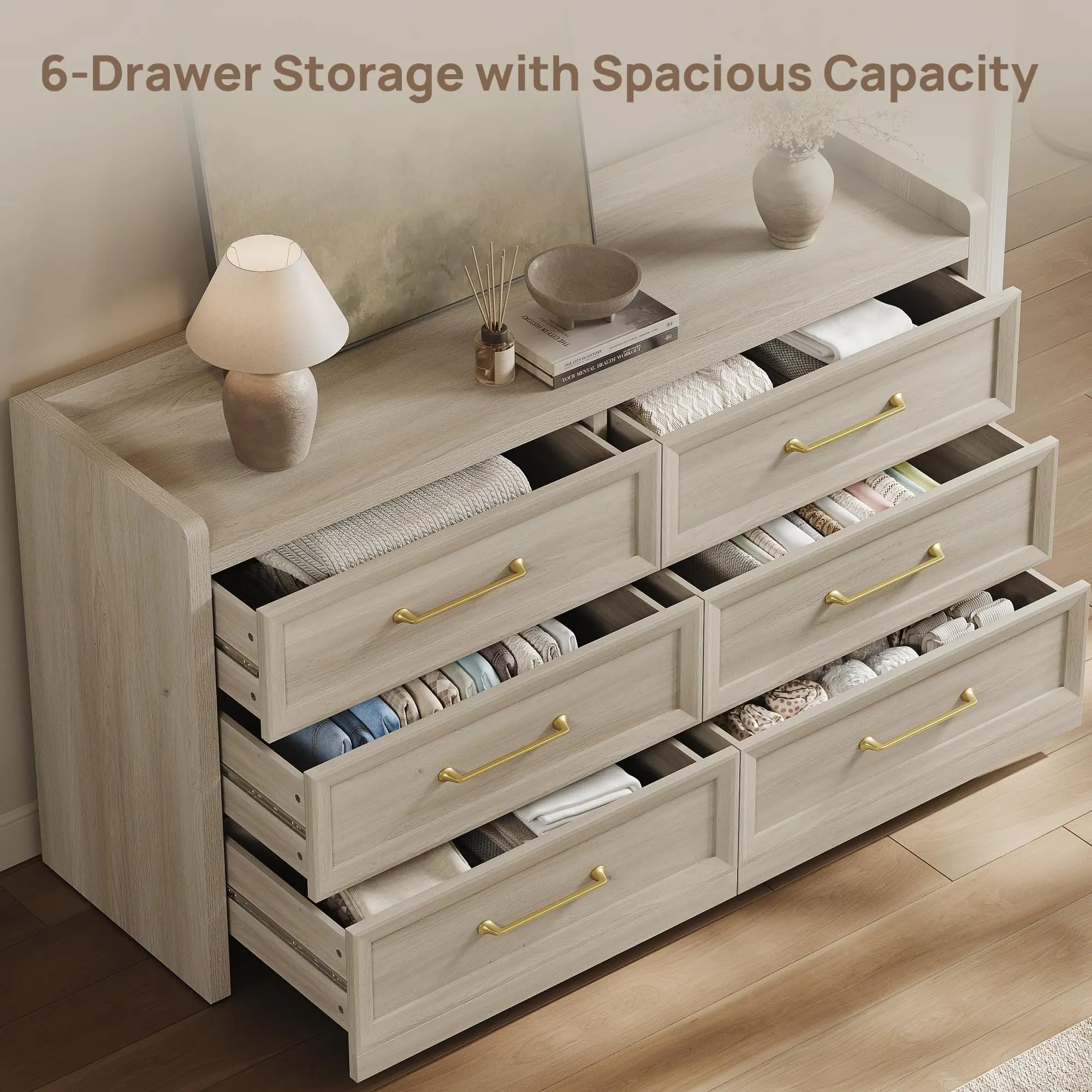 ·【Generous Storage for Every Need】Clothes piling up? Toys taking over the floor? This oversized 6-drawer dresser (56.42"W x 16.93"D x 31.30"H) is wider and deeper than most, providing ample space to organize everything. Store bulky T-shirts, cozy sweaters, extra bedding, or toys with ease. Each deep drawer glides smoothly on high-quality metal slides, making it easy to access your items.