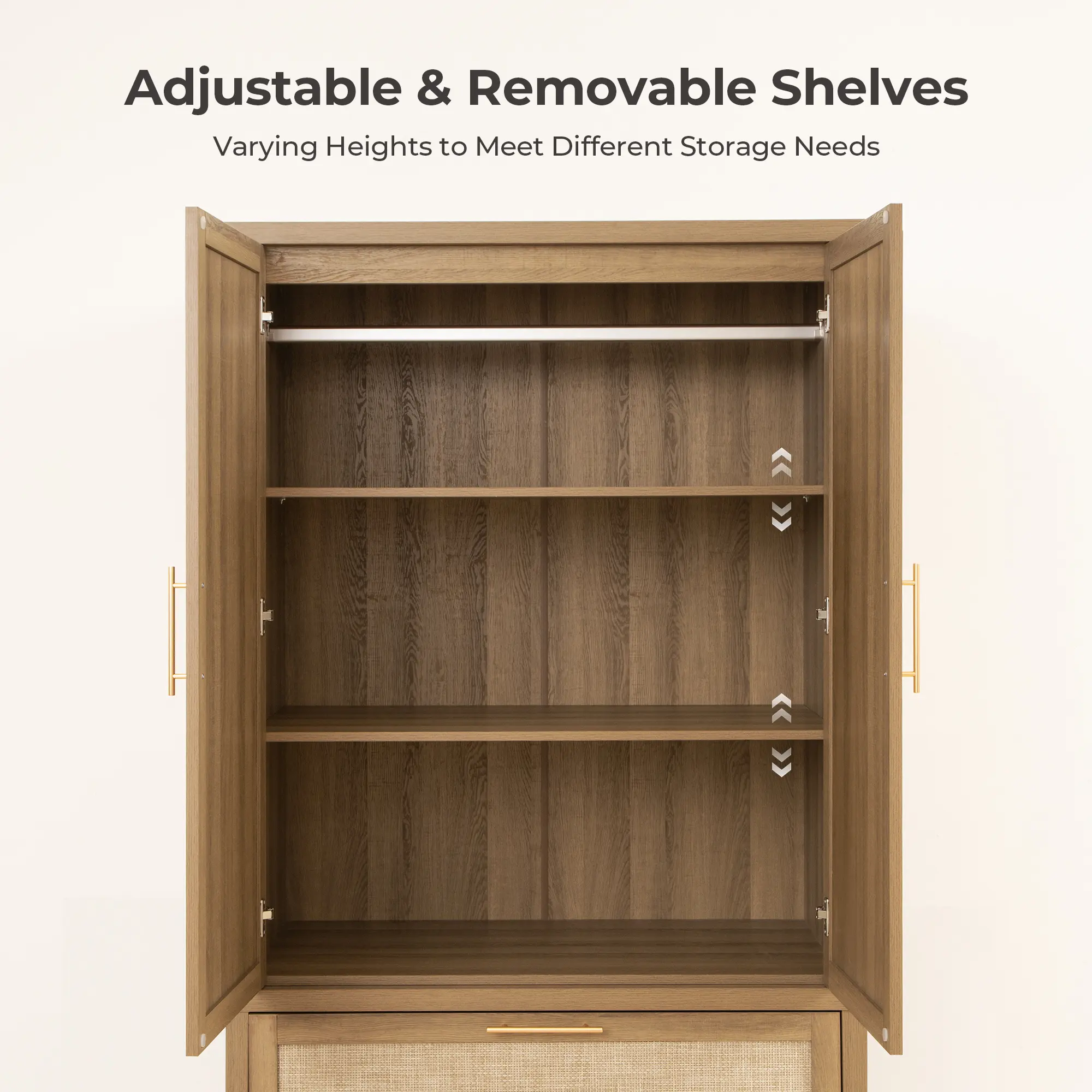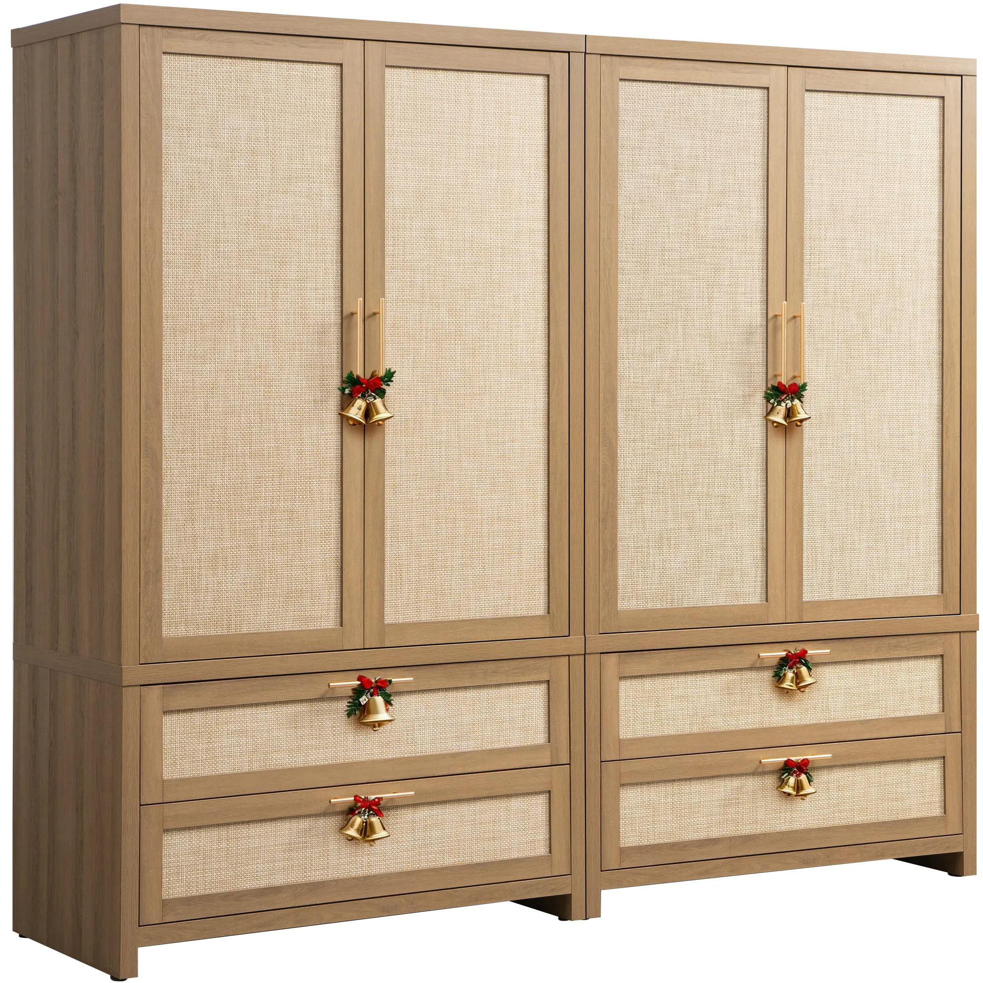 ·【Farmhouse Boho Style】- This farmhouse boho armoire has a simple and elegant appearance. The doorway and drawer surface adopts a unique rattan mesh design, revealing a natural atmosphere, with gold metal handles, adding a touch of sophistication. The collision of the rattan net and the natural oak color, injecting free and random bohemian flavor into the home space.