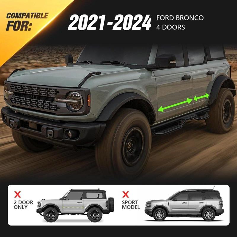 【Compatibility】: EYOUHZ Two Stairs Design Running Boards are compatible with 2021 2022 2023 2024 2025 2026 Ford Bronco 4 Doors (Not for Sport Model). Please verify the product's fitment with your vehicle before completing your purchase.