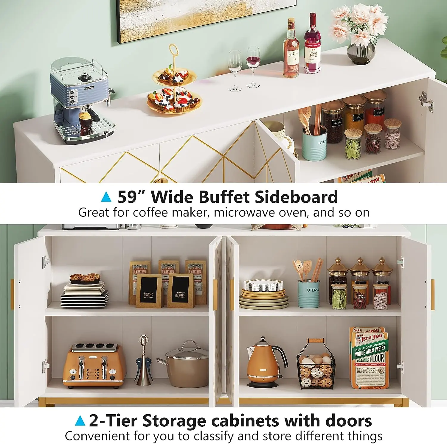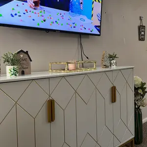 The white buffet cabinet with storage is designed to bring a touch of modern chic to your home decor with its stunning white and gold modern design. With its stylish and modern design, it can fit in with almost any decor style and add a touch of luxury and sophistication to your home.