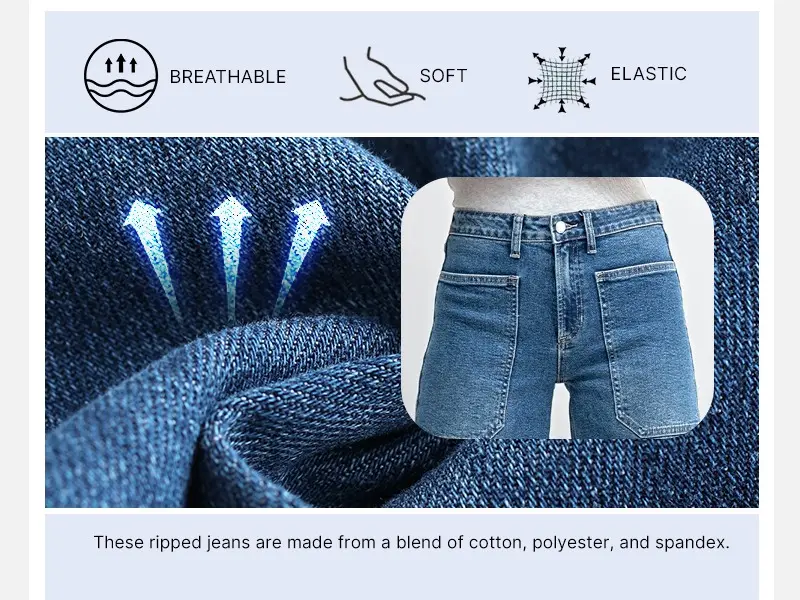 Material: These jeans are crafted from stretchy denim fabric, offering a flexible fit that moves with your body. The material is durable yet soft, ensuring long-lasting wear and all-day comfort without sacrificing shape or style.