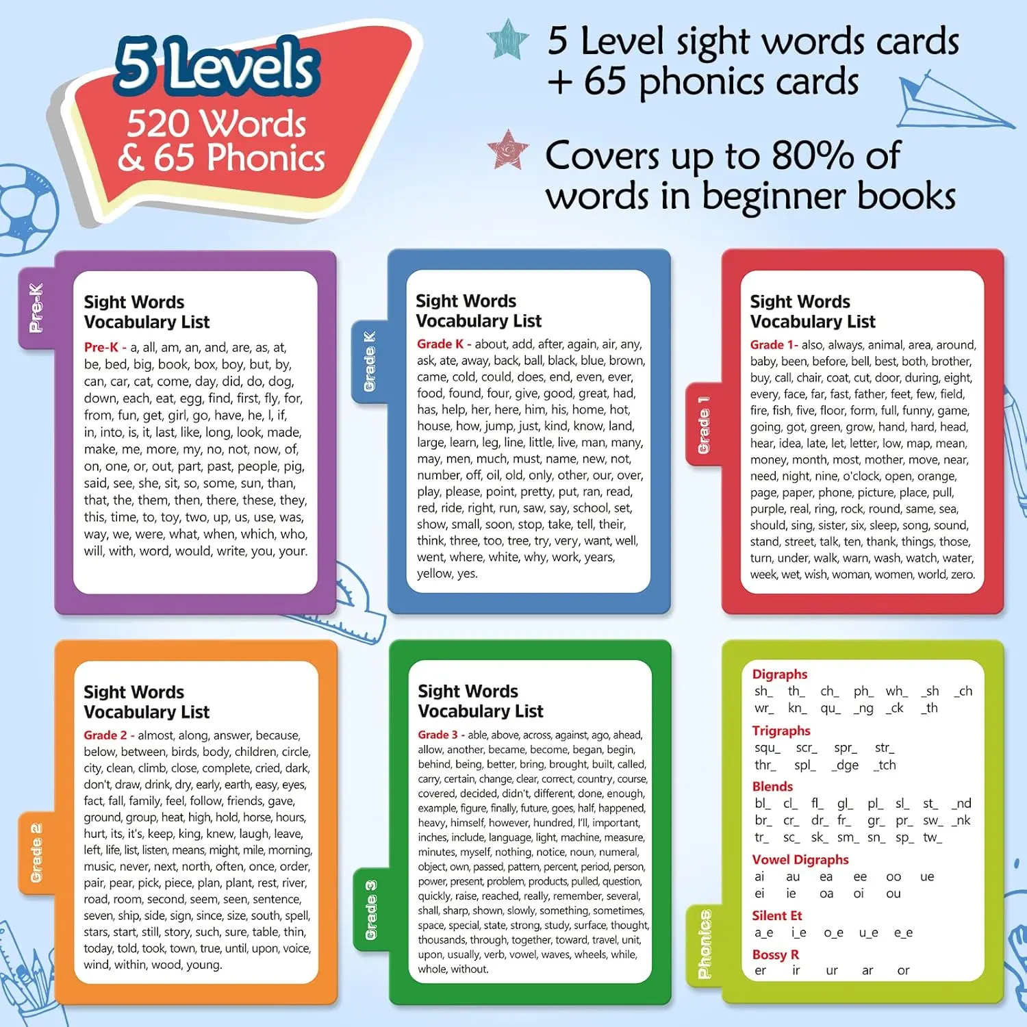My grandson loves the cards, from kindergarten to third grade, over 300 words