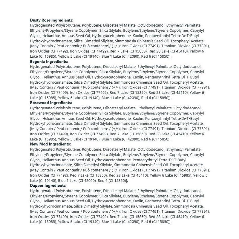| Ingredients | Hydrogenated Polyisobutene,Polybutene,Diisostearyl Malate,Ethylhexyl Palmitate,Octyldodecanol,Ethylene/Propylene/Styrene Copolymer,Silica Silylate,Butylene/Ethylene/Styrene Copolymer,Caprylyl Glycol,Helianthus Annuus Seed Oil,Hydroxyacetophenone,Kaolin,Pentaerythrityl Tetra-Di-T-Butyl Hydroxyhydrocinnamate,Silica Dimethyl Silylate,Simmondsia Chinensis Seed Oil,Tocopheryl Acetate,[May Contain / Peut contenir / Può contenere / (+/-): Iron Oxides (CI 77491),Titanium Dioxide (CI 77891),Iron Oxides (CI 77499),Iron Oxides (CI 77492),Red 7 Lake (CI 15850),Red 28 Lake (CI 45410),Yellow 6 Lake (CI 15985),Yellow 5 Lake (CI 19140),Blue 1 Lake (CI 42090),Red 6 (CI 15850)]. |