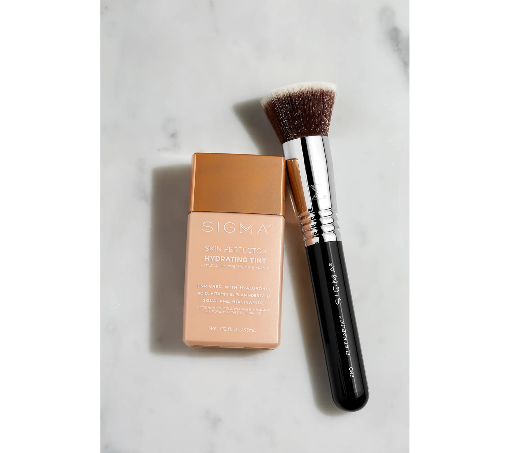 Discover the perfect balance between skin care and makeup with Skin Perfector Hydrating Tint from Sigma. The smooth formula helps provide the hydration of a moisturizer and the lightweight, buildable coverage of a liquid foundation, allowing you to customize your look from sheer to medium coverage. This hydrating tint provides the appearance of a dewy, natural-looking finish. How do I use it: Shake bottle before use. Apply on the center of the face with the foundation brush of your choice. Blend outward using a circular motion. From Sigma Beauty. Includes: