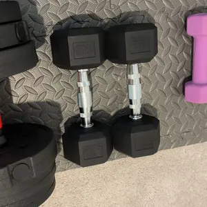 Hexagon-shaped dumbbell heads prevent the free-hand weights from rolling away during rest breaks