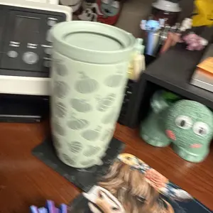 Love my tumbler! The green is beautiful and the pumpkins are so festive. The lid is very easy to get used to and works well! It fits in every cup holder and keeps my coffee super hot!!