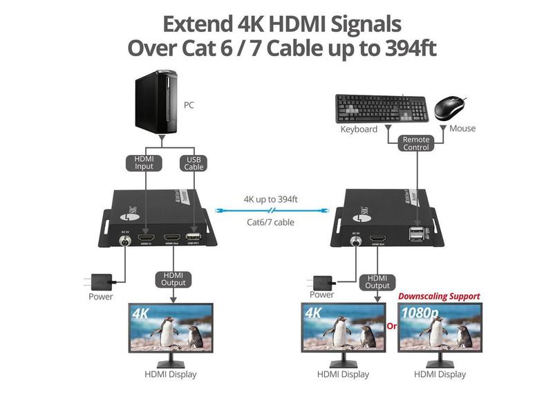 Extend USB Keyboard, Mouse, and 4K HDMI video signals up to 394ft (120m) over CAT6/6a/7 cable. *Good quality CAT cables are essential in delivering quality content.