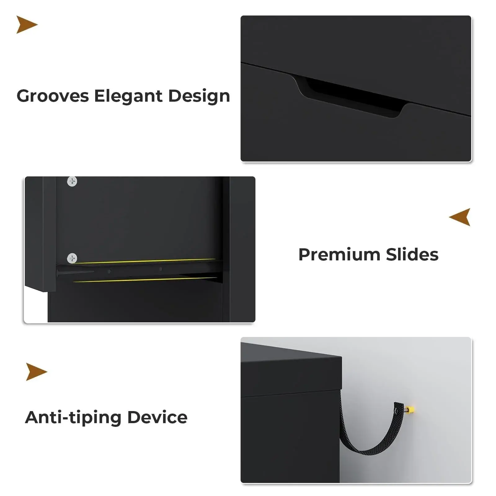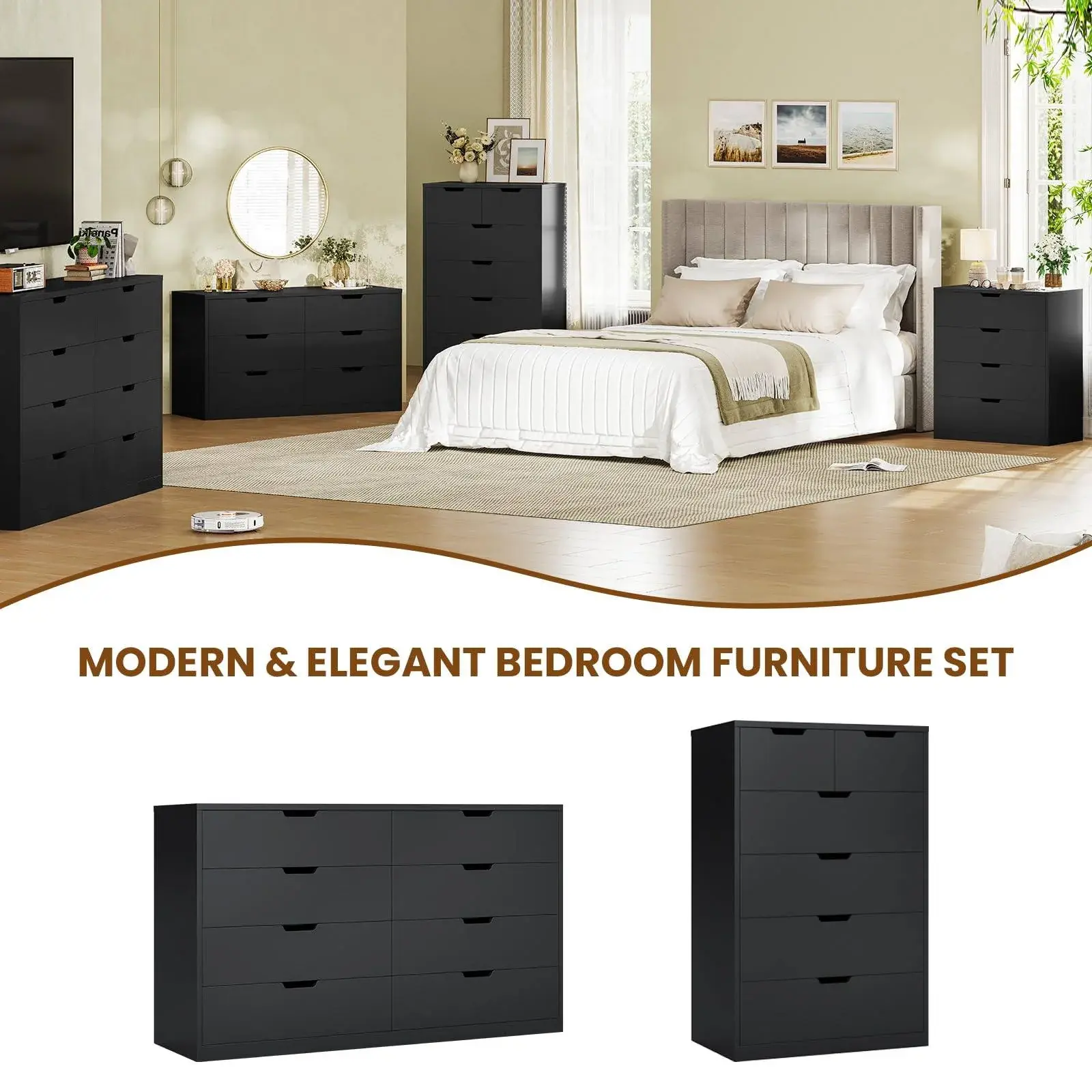 Modern style combined with sufficient storage space offers various placement options. 4 Drawers/tall 6 drawers/classic 6 drawers/8 drawers series dresser perfectly matches with your bedroom, nursery, closet, entryway, dorm, and living room. It also can be perfectly used as TV stand dresser, making it a stylish and safe addition to your home. It features premium thicken MDF board, sturdy dresser base to ensure durability and stability. Equiped with high quality metal slide rails providing smoothly, quietly, steady in daily using. Anti-tripping device will enhance the stability and durability to keep your family members safe.