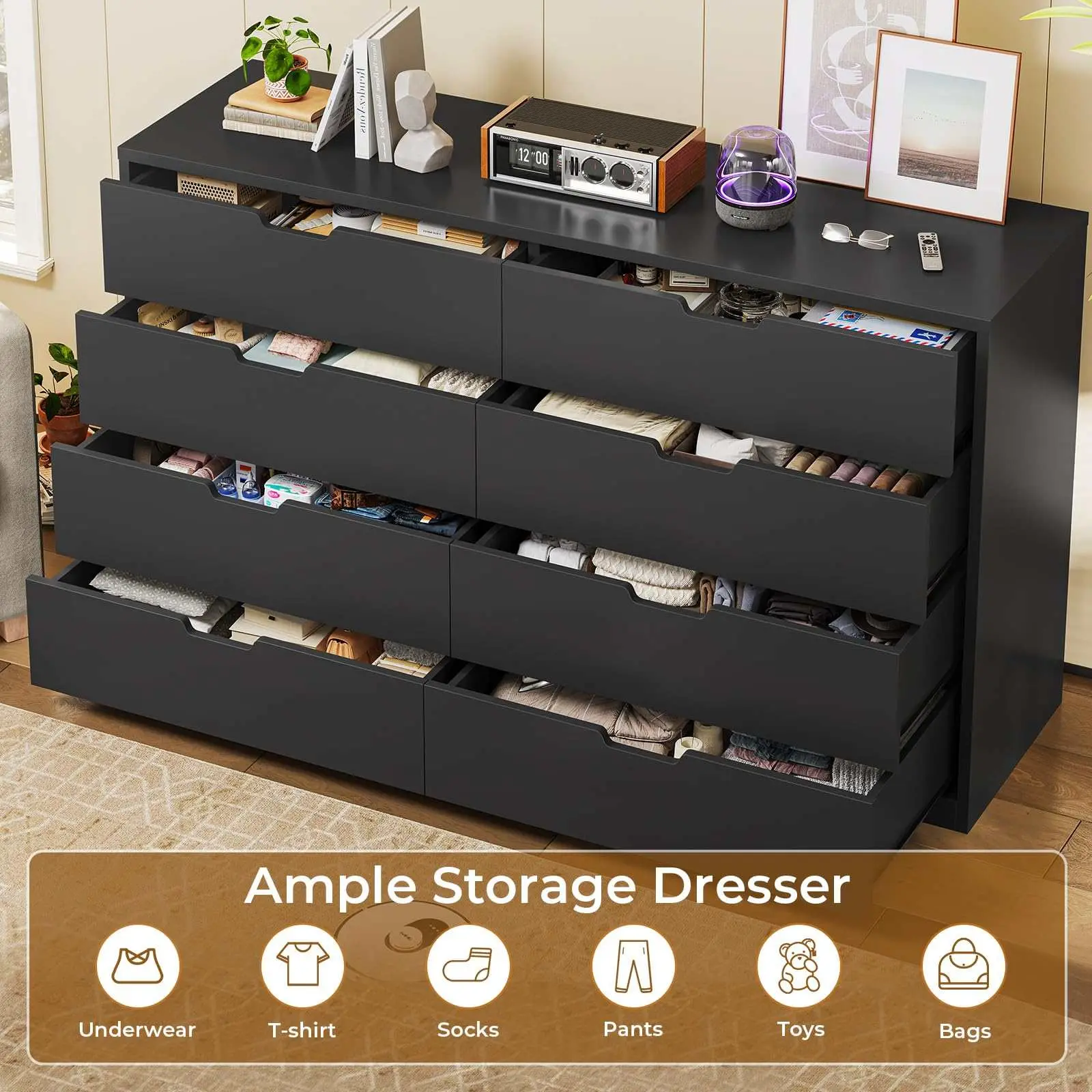The Black dresser equiped with 8 large storage drawers, providing large capacity storage space. Great for organize your clothes, toys, accessories or other items. Large table top also is ideal for placing your decors, photos, plants and lamps, keeping your room neat and tidy.