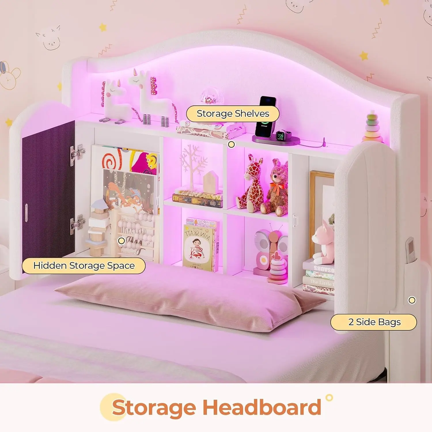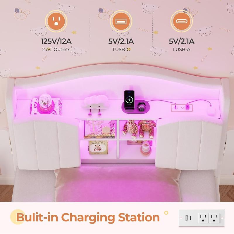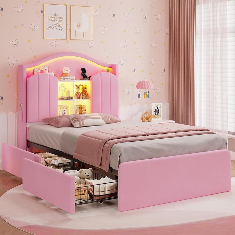 Girls Twin Size Bed Frame with 4 Drawers & Hidden Storage Headboard