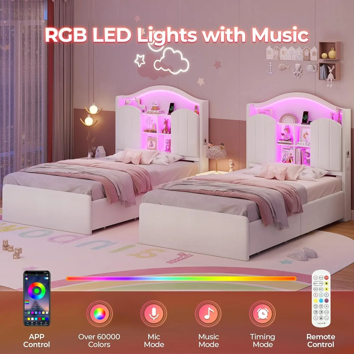Easily control by APP or key for change over 60,000 DIY colors options and brightness levels. Aslo adjust dynamic modes, voice control, music mode, timing function offers a nice ambiance for your bedroom, brighting up your nignt.