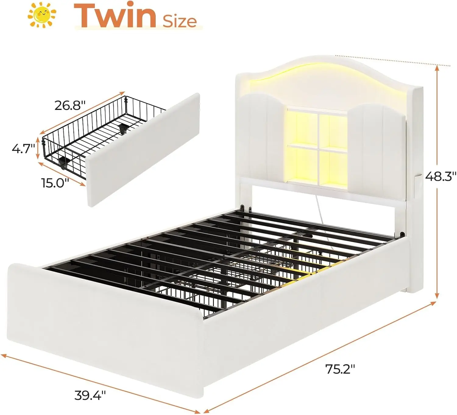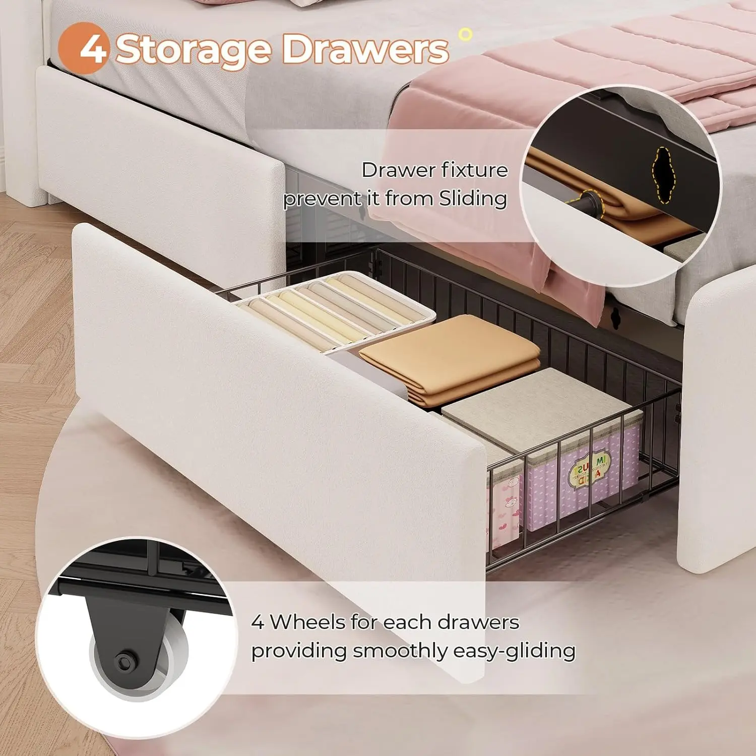 4 Large storage drawers underneath the bed save your room space and add more storage space for bedding, toys, books,seasonal clothes etc. 4 smooth wheels for easy sliding in and out. Fixed holes for easily secure drawers to the bottom of the bed.