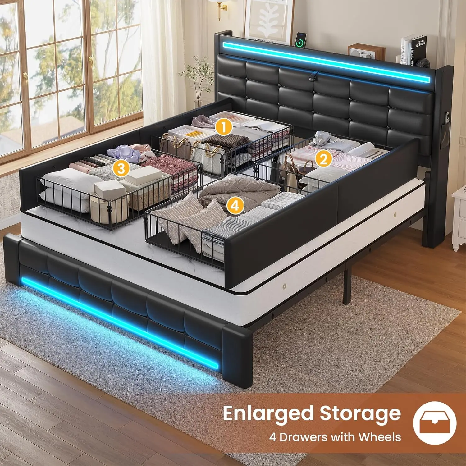 Sikaic LED Bed Frame with Charging Station and 4 Storage drawers