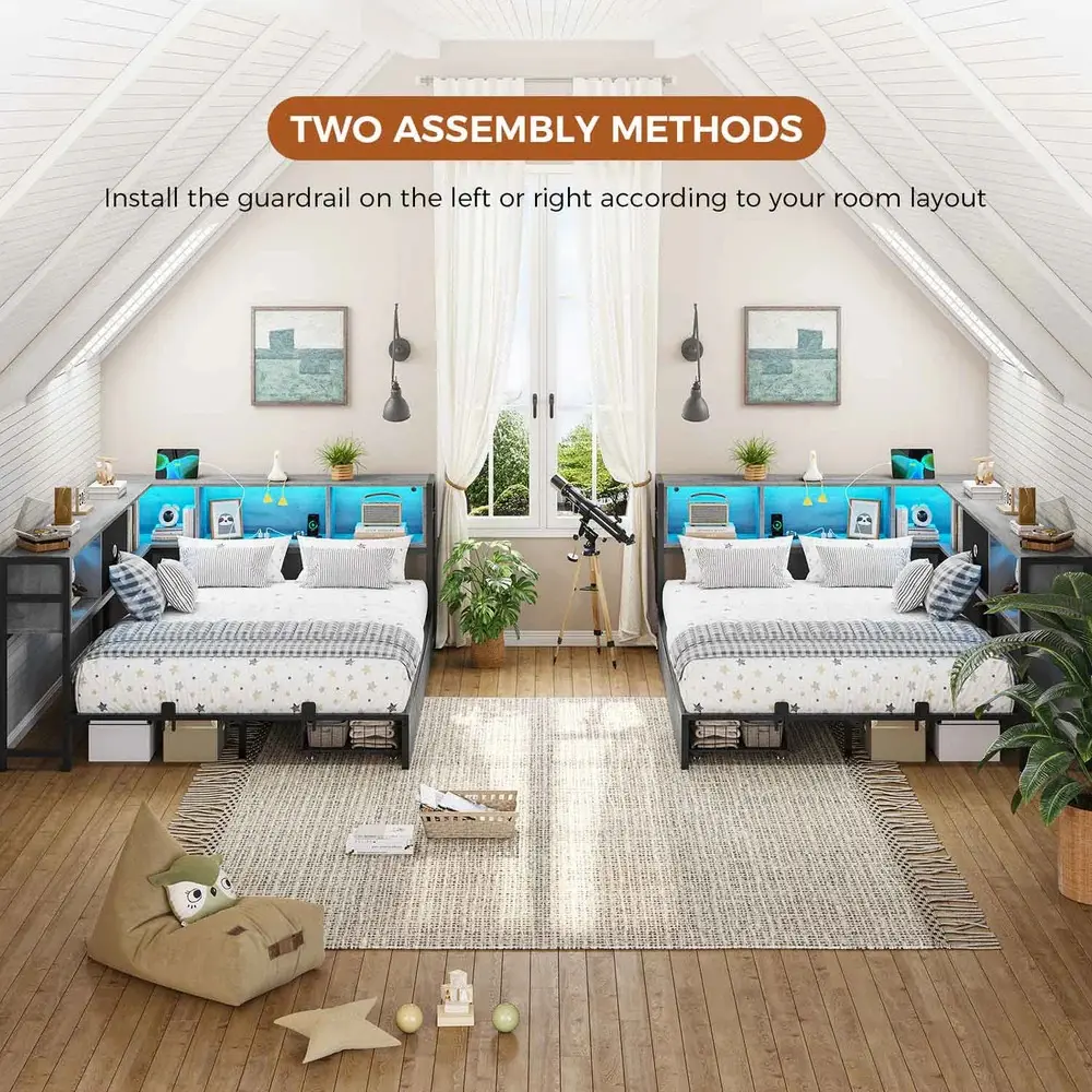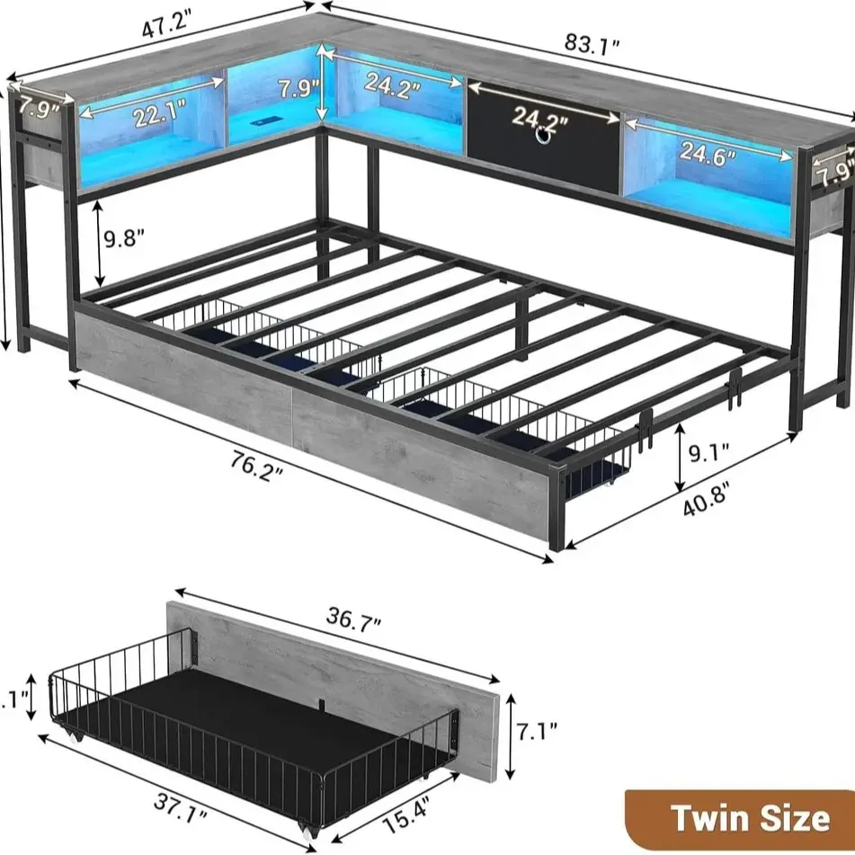 Corner Bed Frame with Led Lights and Charging Station and Storage