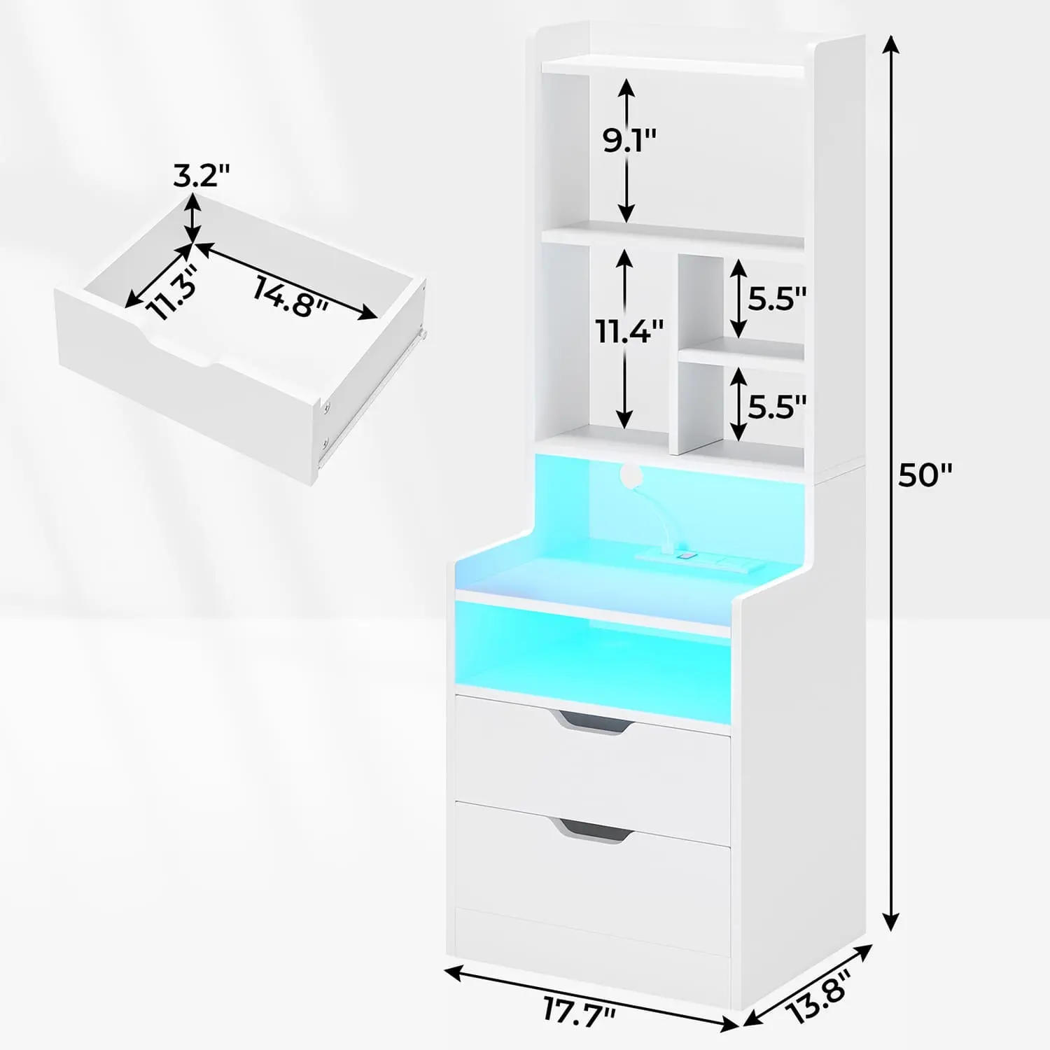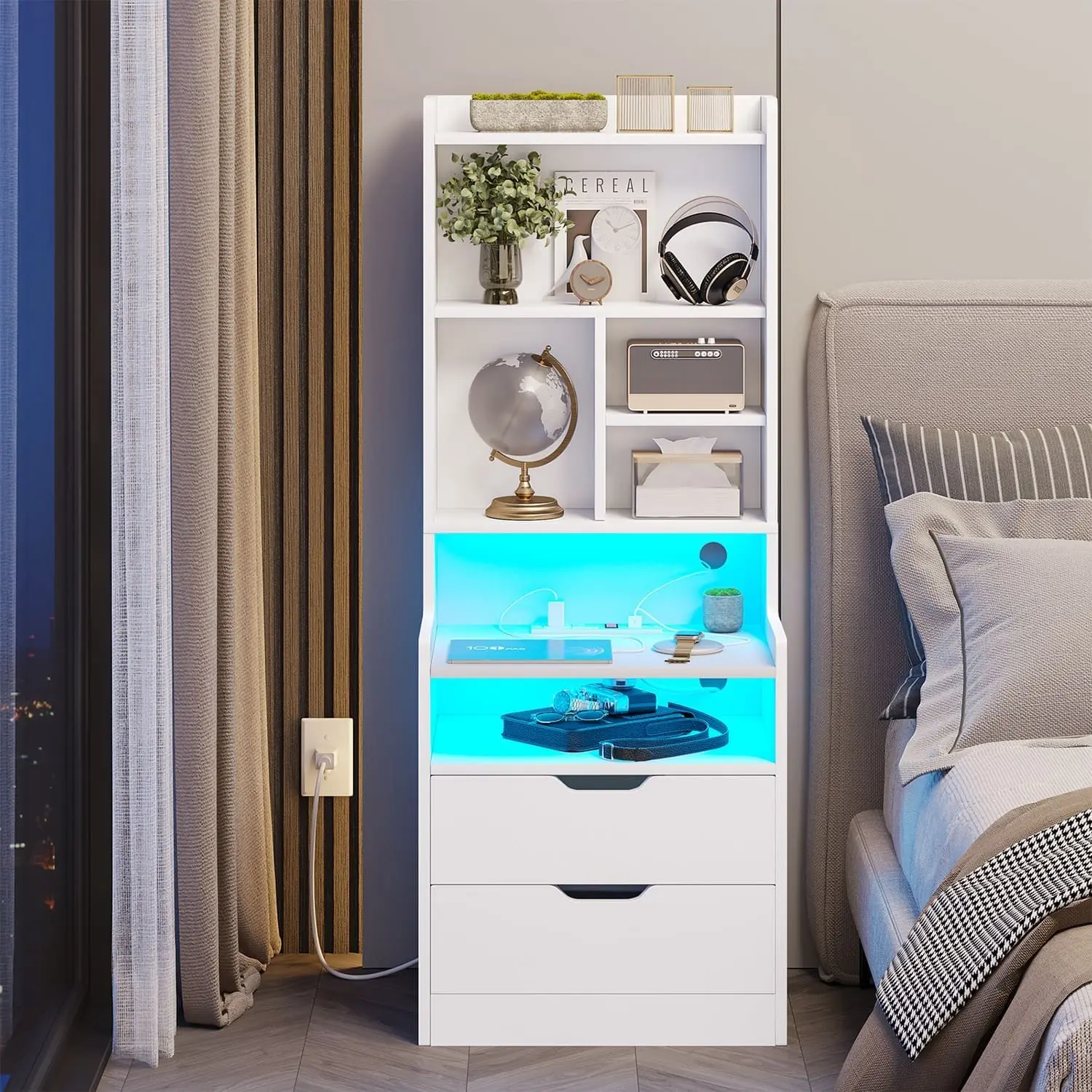 The bedside nightstand offers over 60000 colors. Control via Phone App or Button Switch for brightness, color, mode, and timing. Design your light show effortlessly. This LED nightstand enhances your life with smart, customizable lighting.