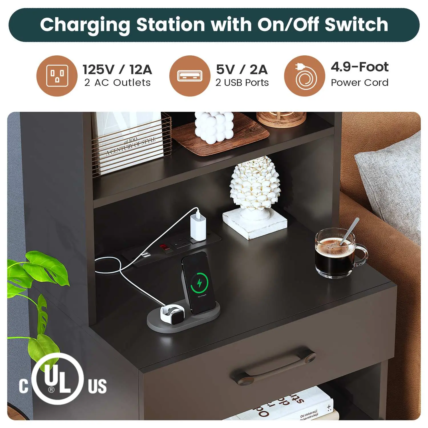 Nightstand&Bookshelf2 In 1 with Charging Station & LED Lights