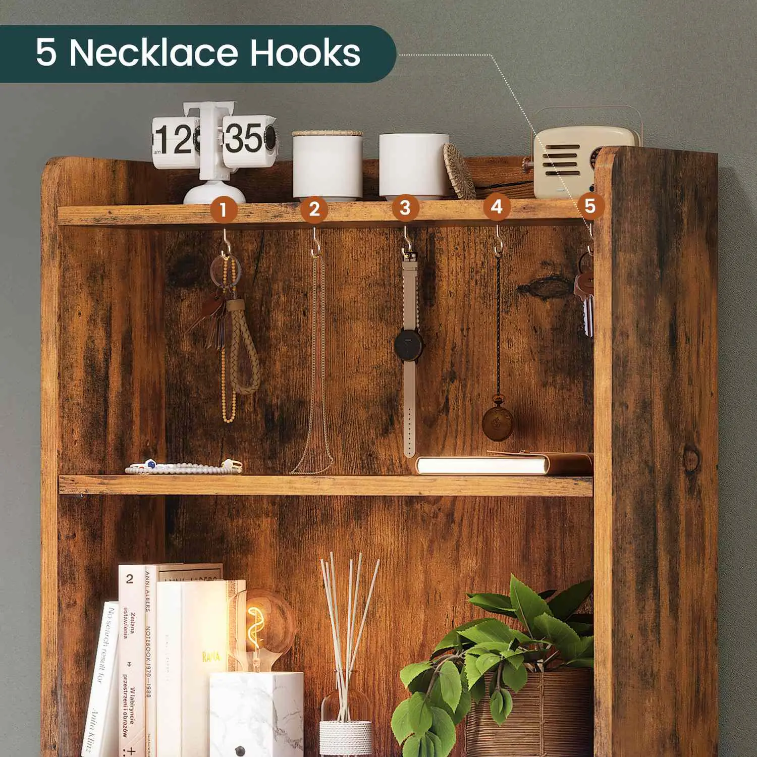 An extra surprise! The upper shelf is equipped with 5 hooks for your necklaces, earrings or bracelets, no need for separate jewelry organizer.