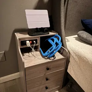 The Sikaic Grey Nightstand features 3 drawers and a charging station. This modern bedside table is designed for bedroom essentials. It includes 2 USB ports and 2 outlets for phones and tablets. The built-in charging hub with a safety switch ensures enhanced safety and energy efficiency. Perfect for organizing your room essentials.
