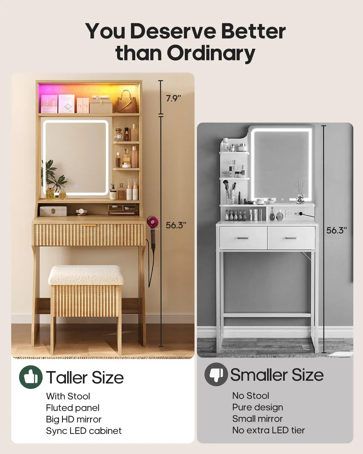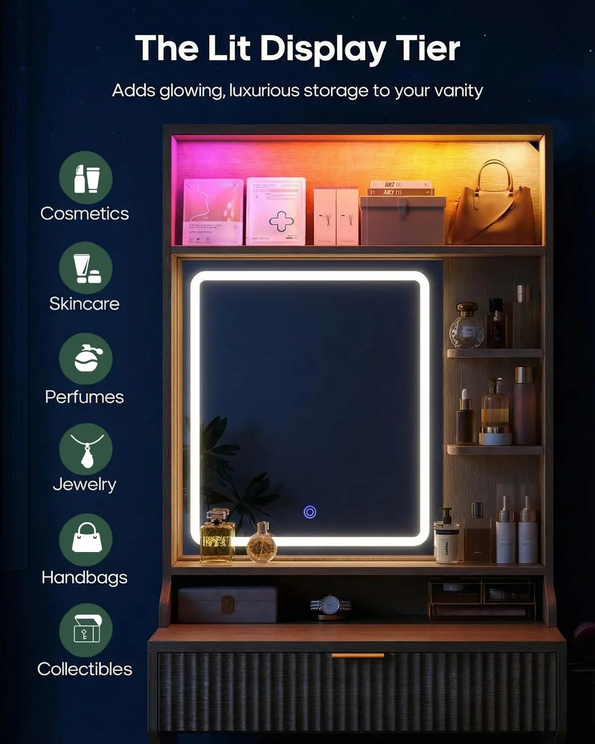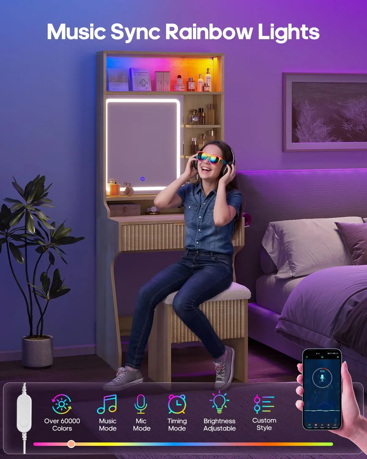 ·Immersive Smart LED Lights: Create the perfect atmosphere with 60,000 customizable colors controlled by switch or App. The dynamic LED light strips can sync to your favorite music, pulsing and flowing with the rhythm, turning your vanity into a glowing selfie station or a relaxing skincare sanctuary.