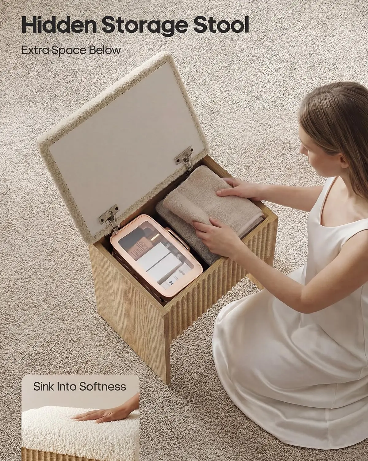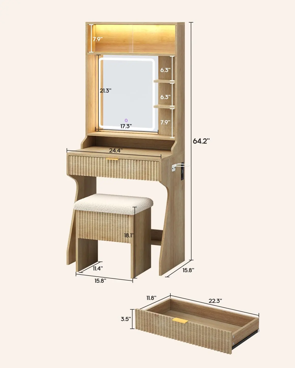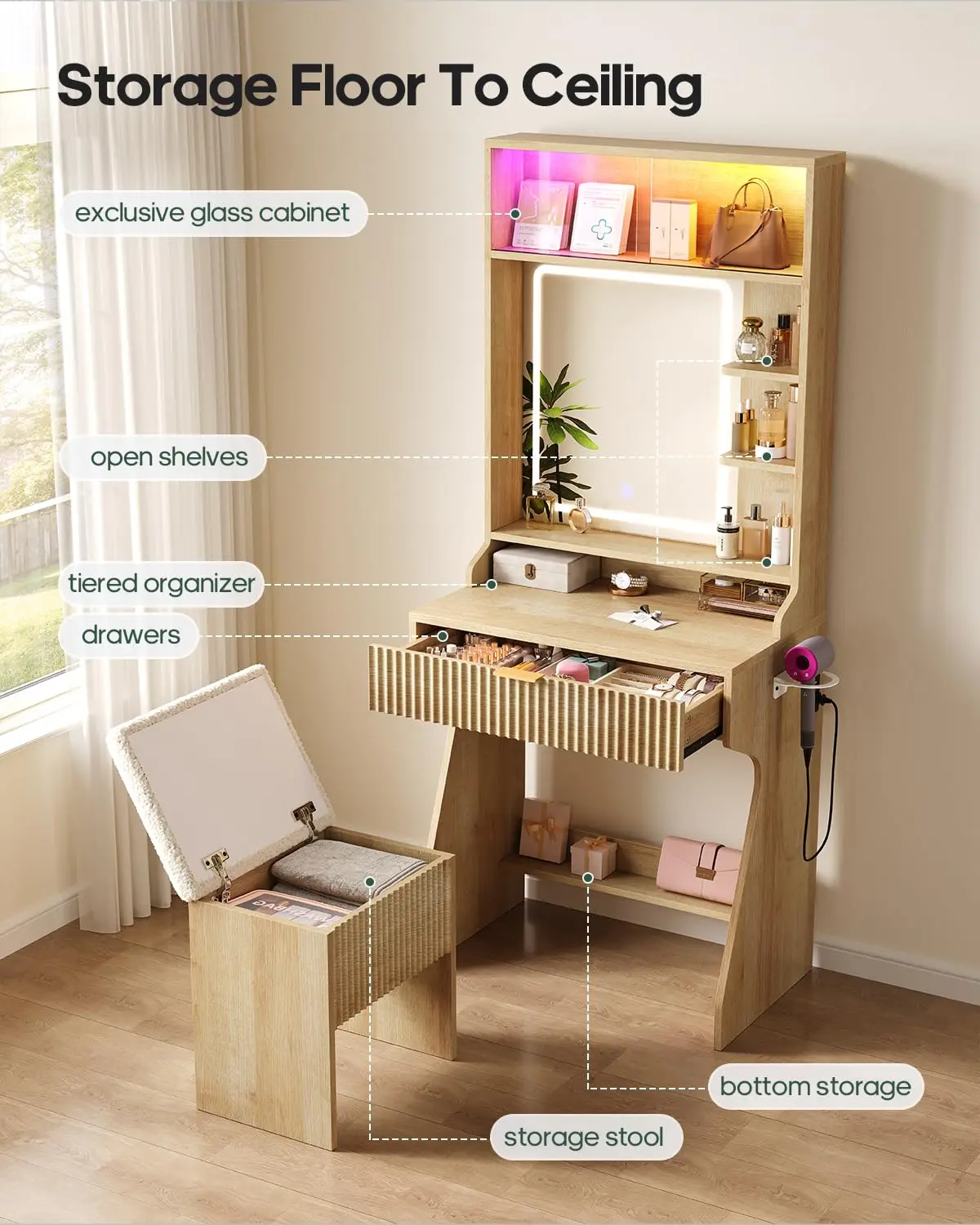 ·Small Space, Big Storage: Designed as a floor-to-ceiling storage solution, this vanity desk maximizes vertical space while keeping your beauty essentials beautifully organized. Featuring a glass display cabinet, open shelving, a deep drawer, and a chic teddy-fabric stool with hidden storage, it transforms everyday organization into a luxurious showcase, perfect for bedrooms or walk-in closets.
