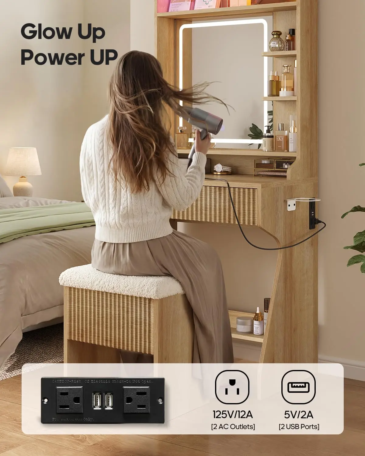 ·Charge, Style, & Decorate: Equipped with an integrated power station including 2 USB ports and 2 AC outlets, plus a convenient hairdryer holder, this vanity keeps cords organized and essentials within reach. The elegant fluted design adds a designer touch, making it both a practical workstation and a stunning focal point in your room.