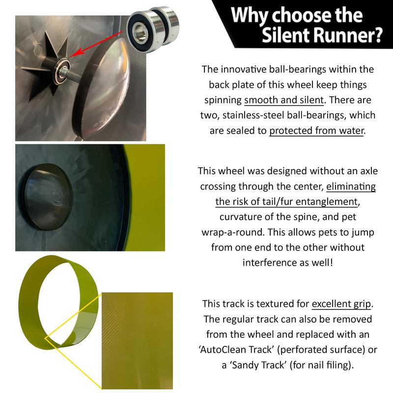 Looking for a safe, quiet, and durable exercise wheel for your furry friends? Look no further than Exotic Nutrition's Silent Runner Wheel 12" Wide. This innovative wheel is specifically designed for hedgehogs, rats and similar-sized animals. The dual-ball bearing technology ensures a smooth, quiet spin, so you can enjoy peace and quiet while your pets exercise. Unlike other wheels, there's no axle, which means there's no risk of fur or tail entanglement. Plus, the textured running tracks provide excellent grip for your pets. The wheel completely disassembles for easy cleaning, making it a breeze to maintain. And with bean-shaped openings and a solid black rear wall, this wheel is pet-preferred. Trust in the Silent Runner Wheel 12" Wide for a safe spin every time.