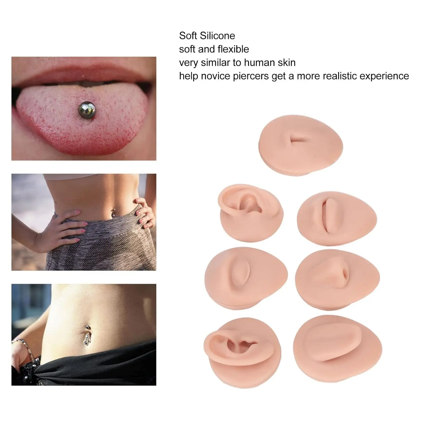 Soft Silicone: The body piercing practice model is made of food grade silicone, which is soft and flexible, very similar to human skin.