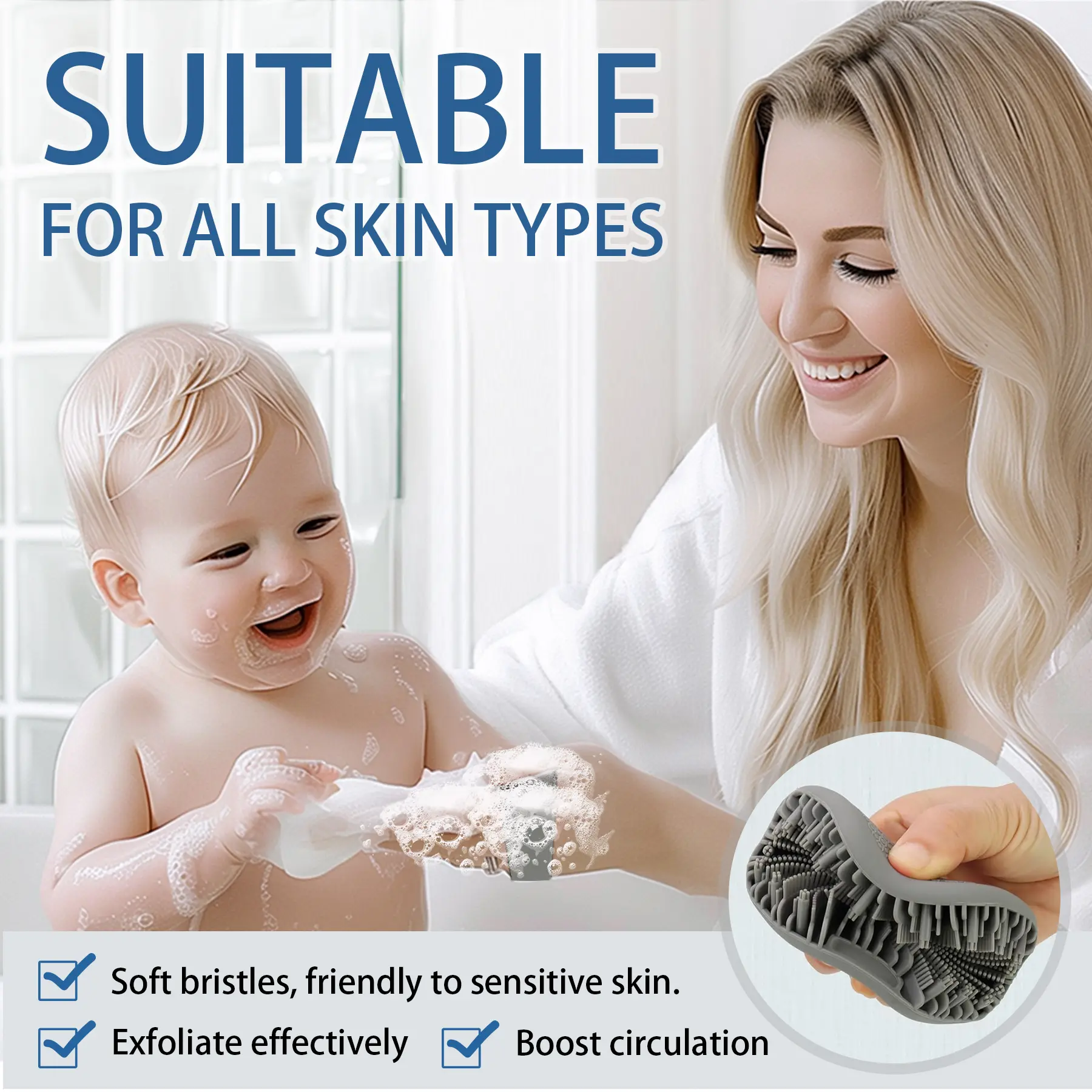 The skin-friendly soft silicone exfoliating brush is perfect for all skin types, especially sensitive skin. It is gentle on the skin without causing irritation or redness, more durable and hygienic than loofahs, and doesn’t cause itching.