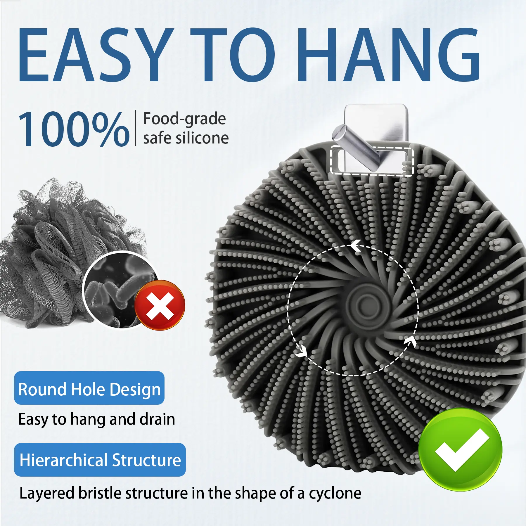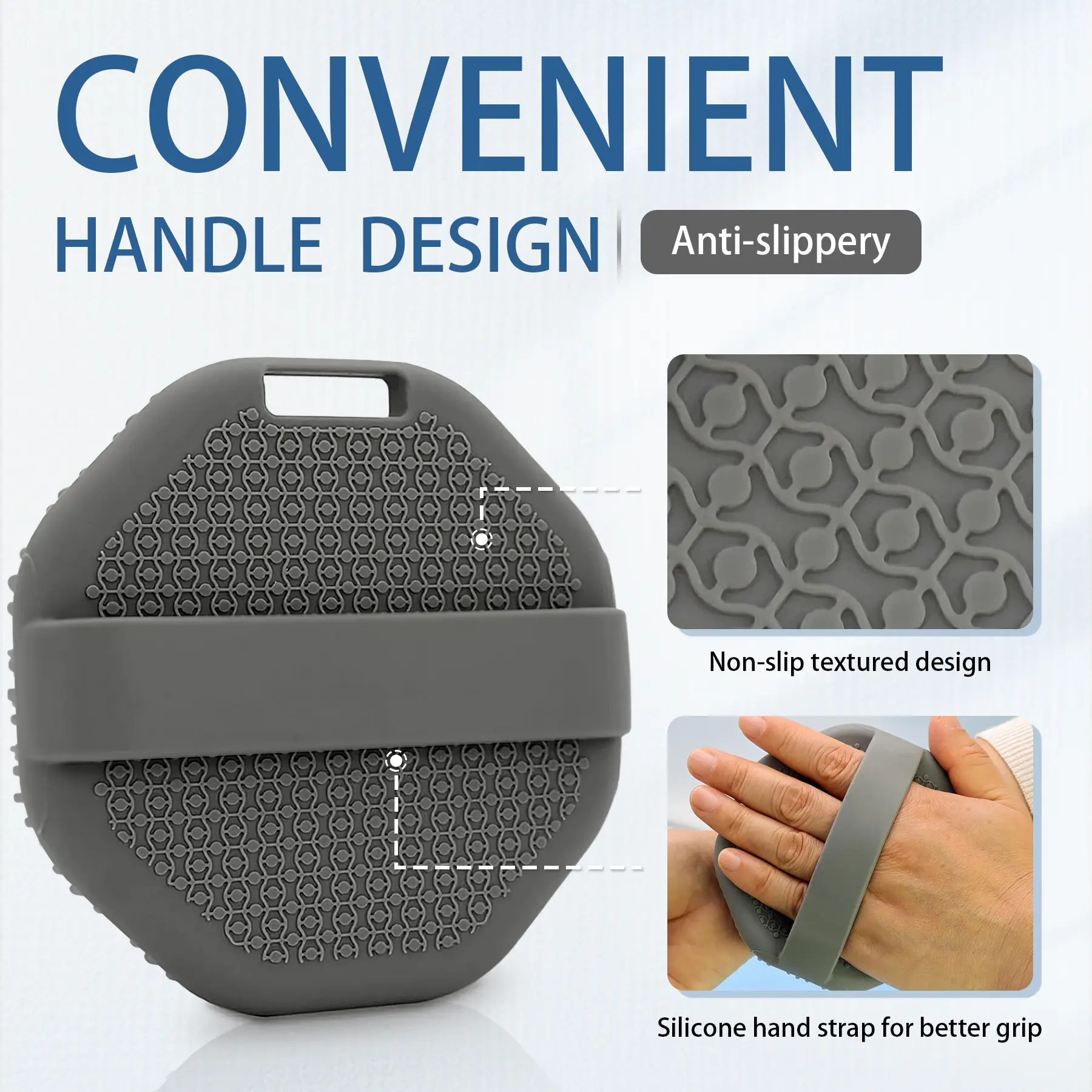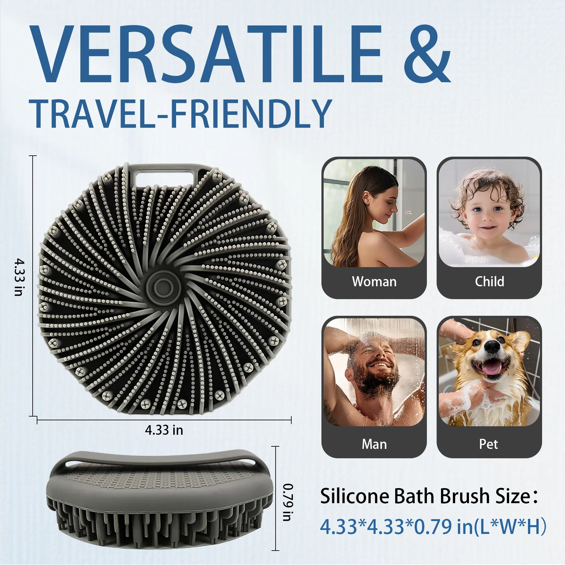 Designed with ergonomics in mind, our shower brush features an easy-to-grip handle. Its round shape and palm-sized design fit perfectly in your hand, preventing it from slipping during use. Additionally, it has a small hole for easy hanging and drying. Compact and lightweight, it’s ideal for travel.