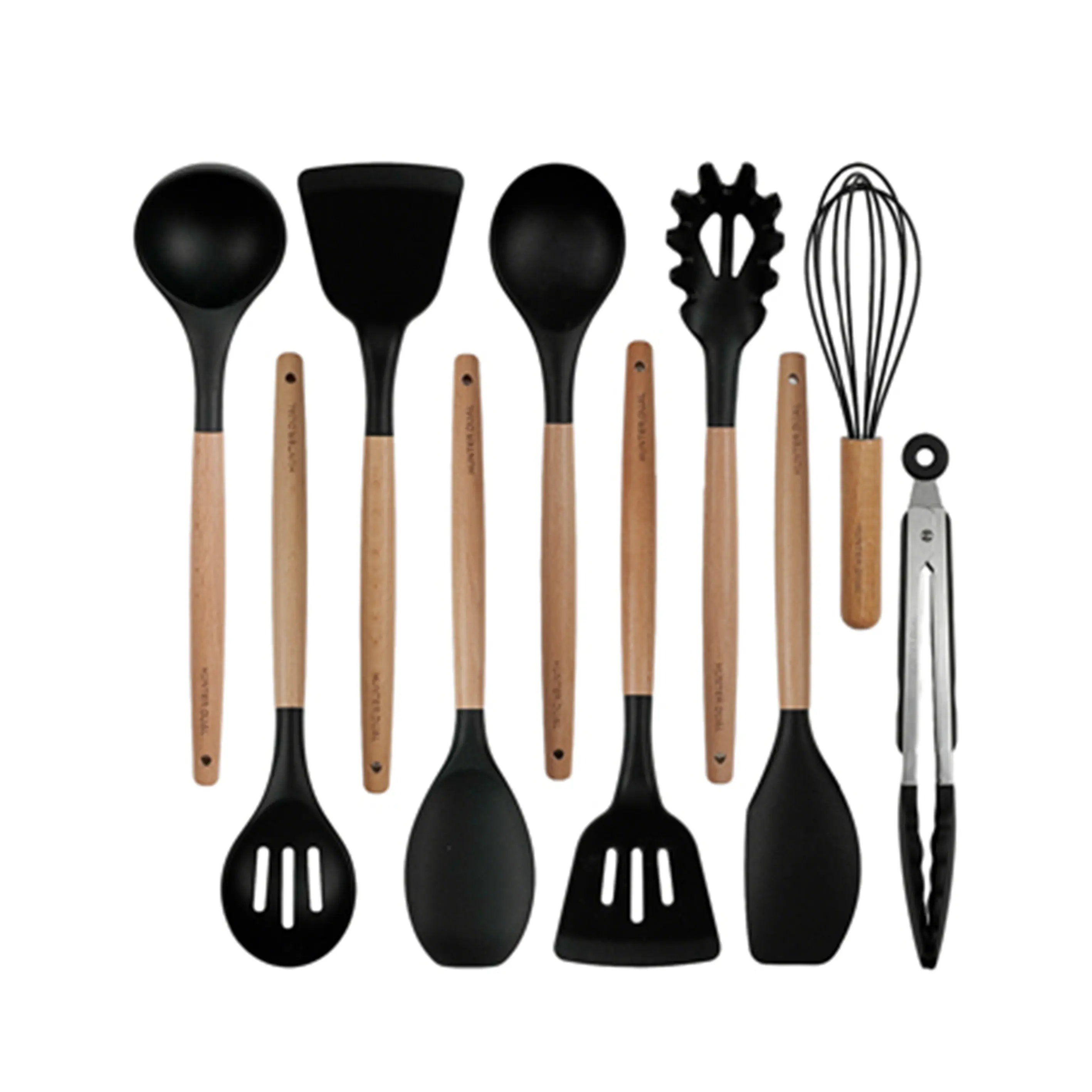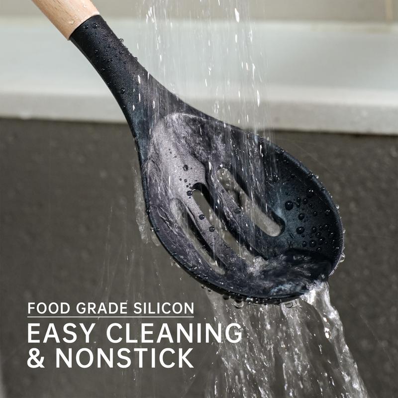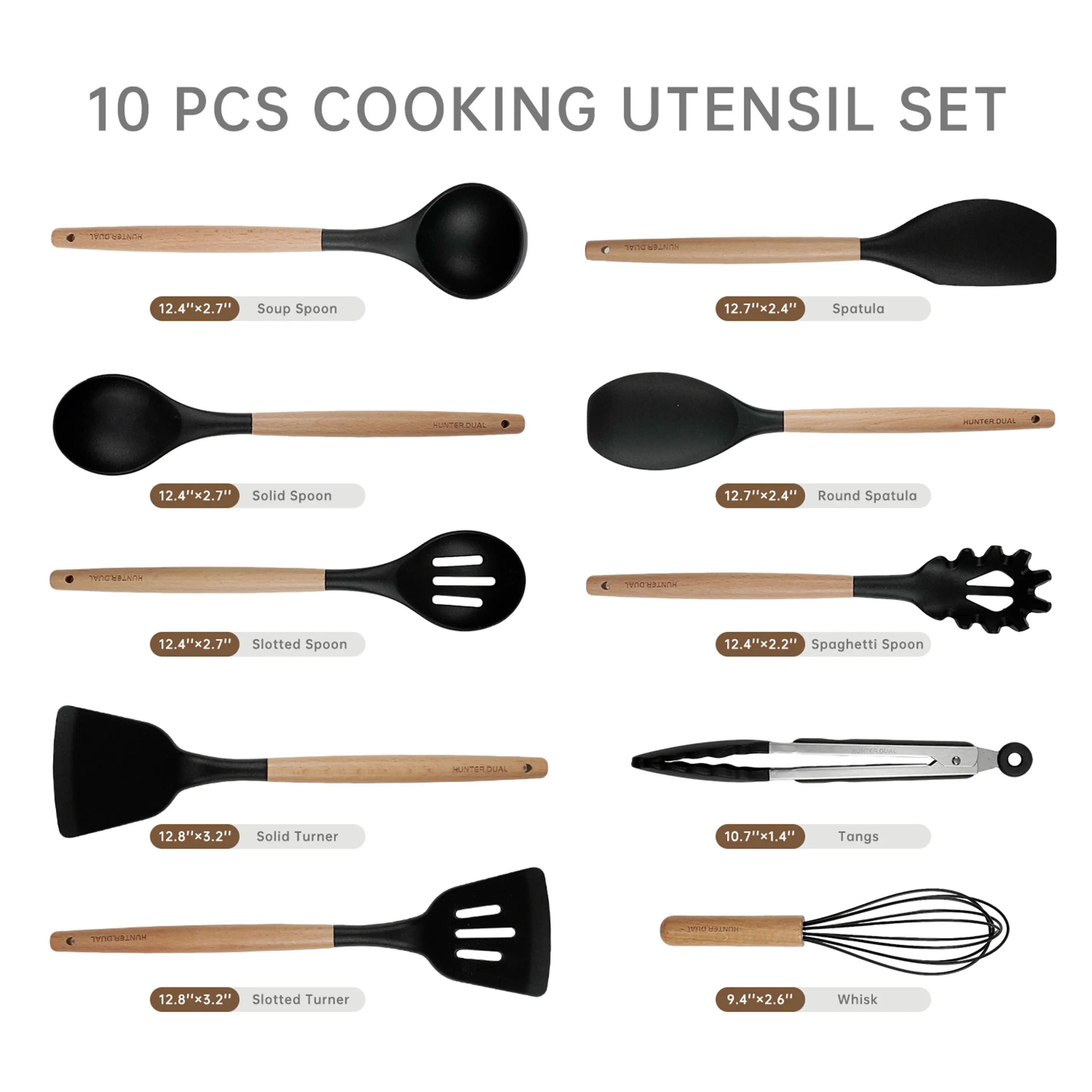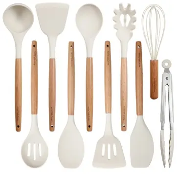 ·Includes 10 essential tools: silicone spatula, round spatula, solid spatula, slotted spatula, slotted spoon, solid spoon, soup spoon, pasta spoon, tongs, and egg whisk. Each has a hanging hole for storage.