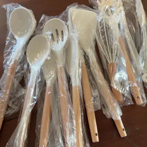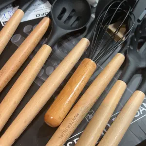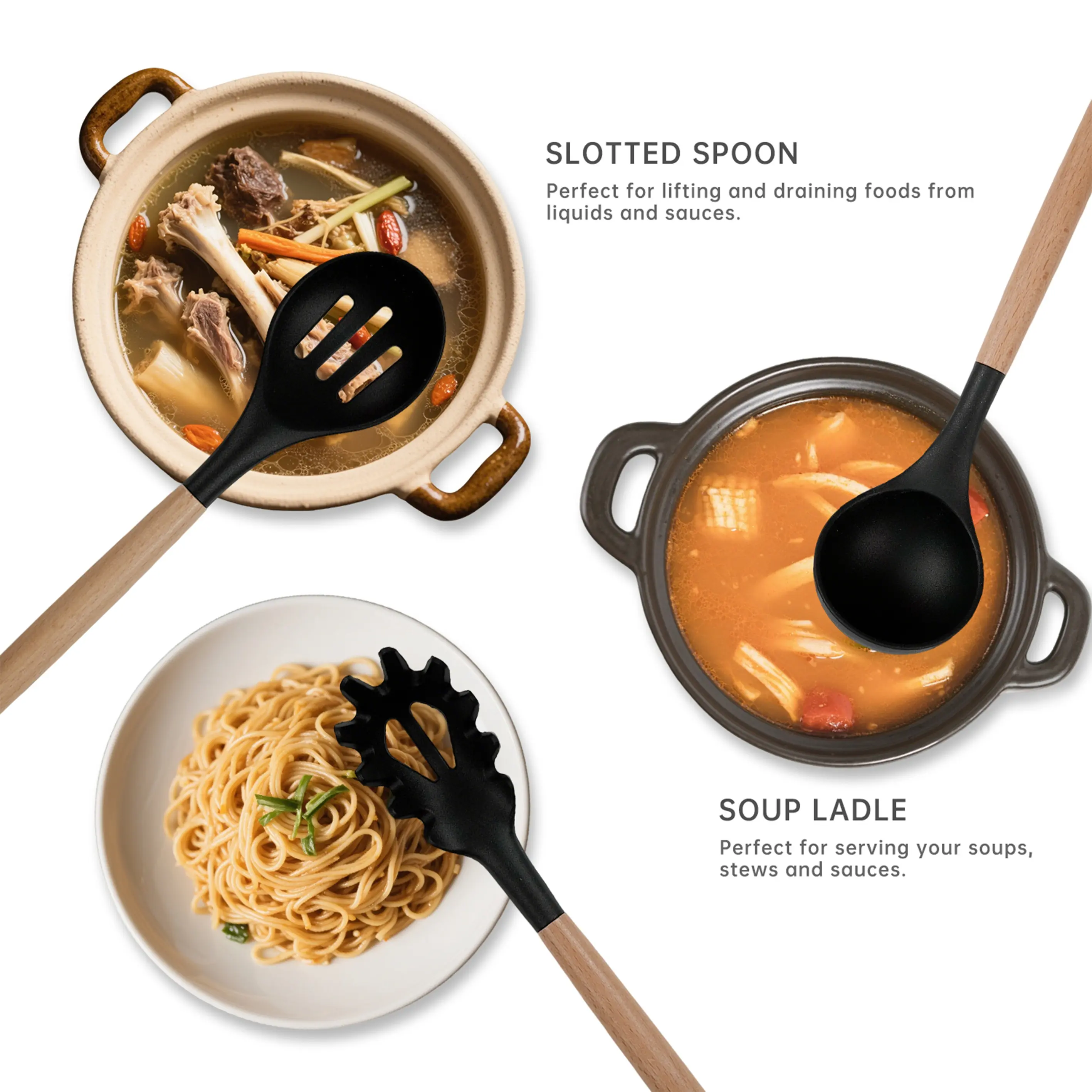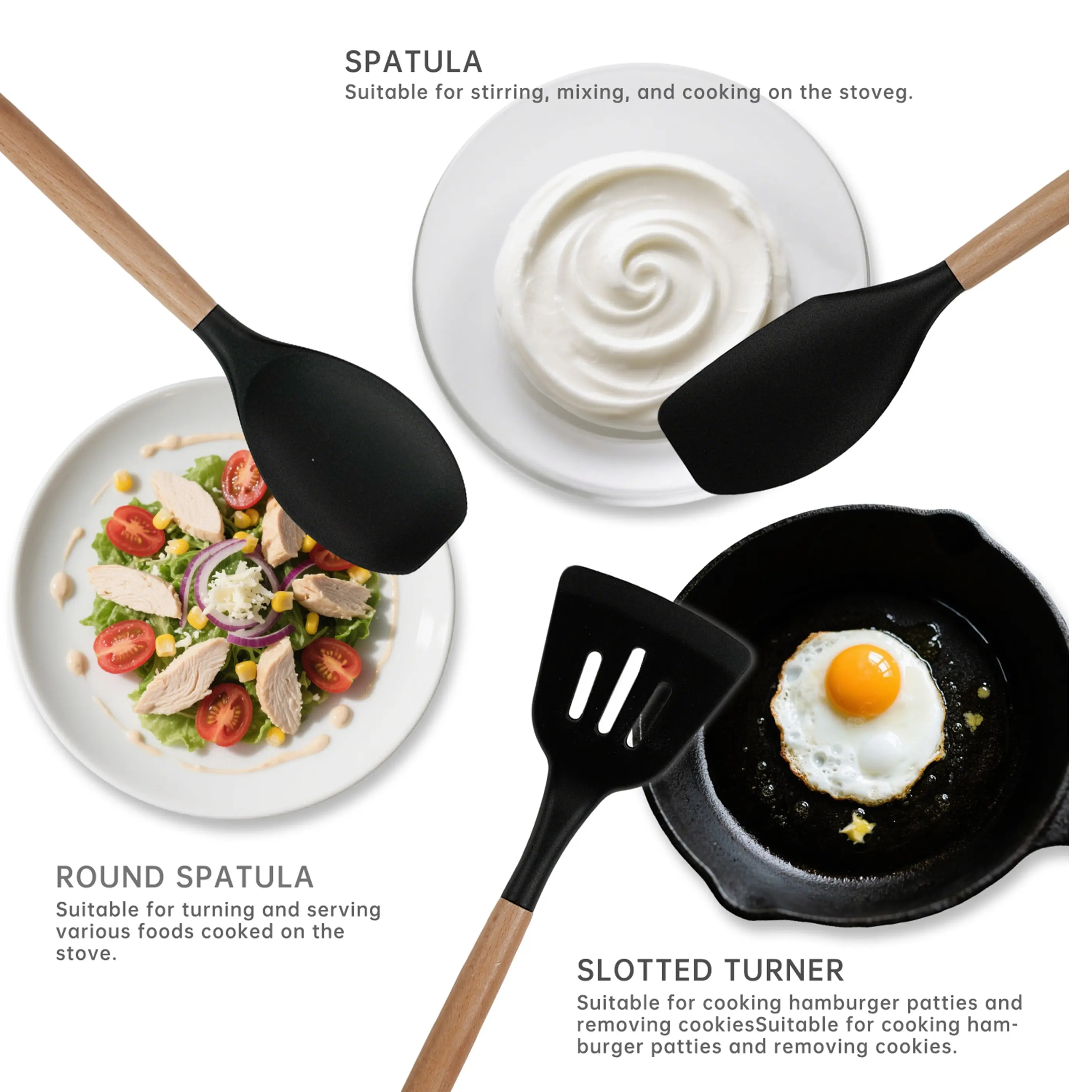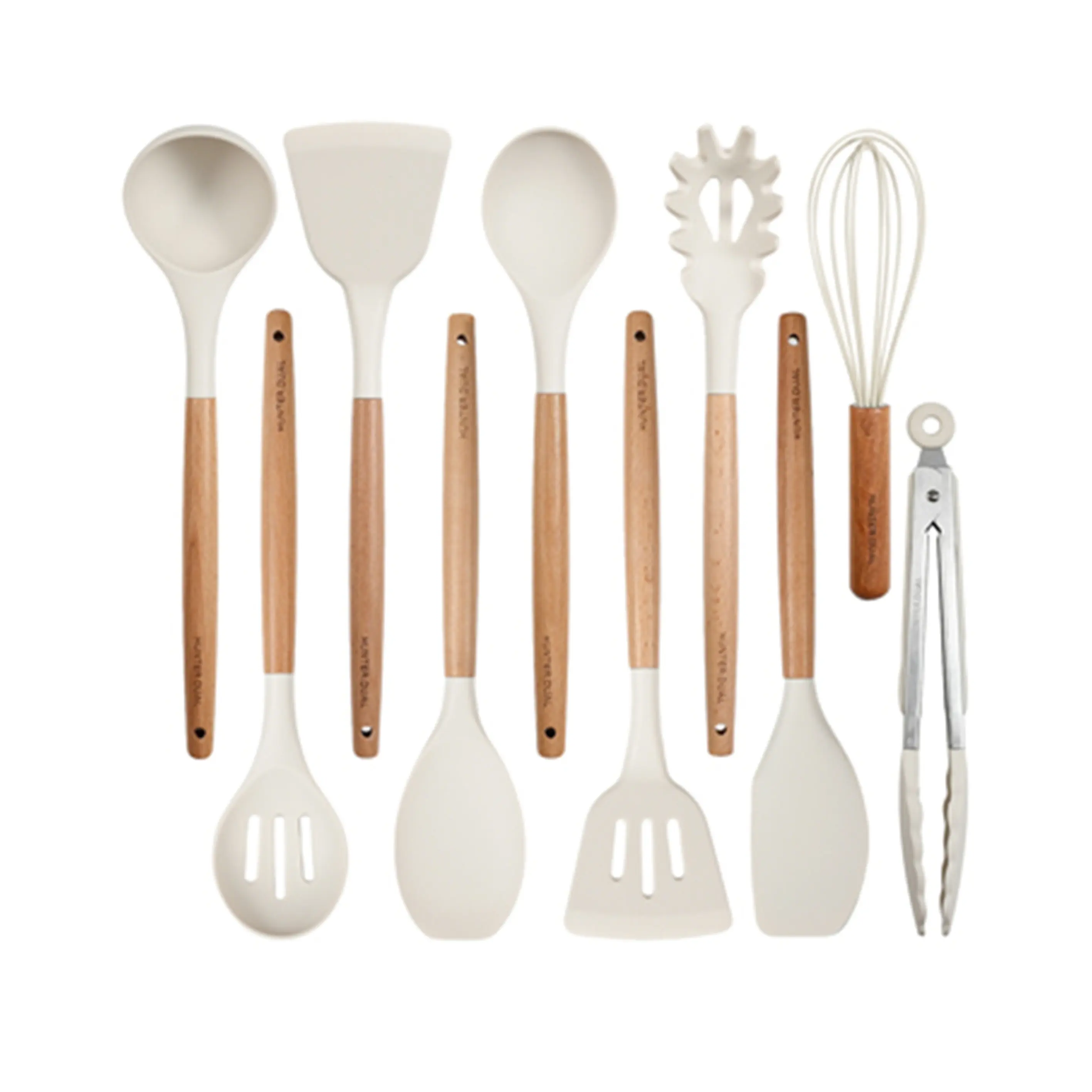 ·Includes 10 essential tools: silicone spatula, round spatula, solid spatula, slotted spatula, slotted spoon, solid spoon, soup spoon, pasta spoon, tongs, and egg whisk. Each has a hanging hole for storage.