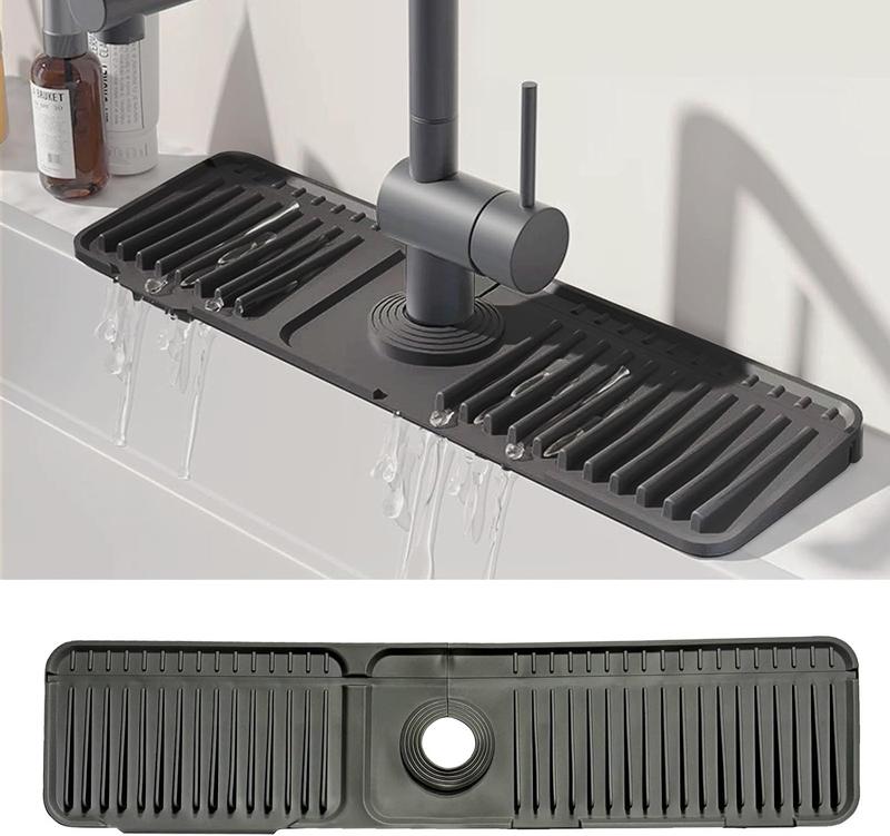 ·【Adjustable Size】This silicone faucet mat for kitchen sink features an adjustable hole diameter design (2.5 inches - 2.75 inches) that fits most standard faucets. It is a very snug-fitting kitchen faucet guard, including RV and farmhouse sinks, and bathroom faucets. The corresponding hole diameter can be adjusted according to the size of the faucet. It is a well-designed kitchen sink accessories.