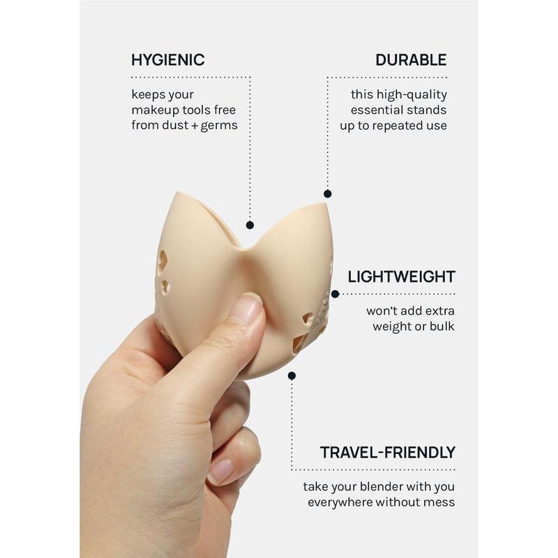Designed to keep your makeup blender germ-free + the inside of your makeup bag or purse clean, this case is for travel + everyday use. It’s vented to stop bacteria + allows damp blenders to air out. Easily flexes open + completely squishes down for easy storage.
