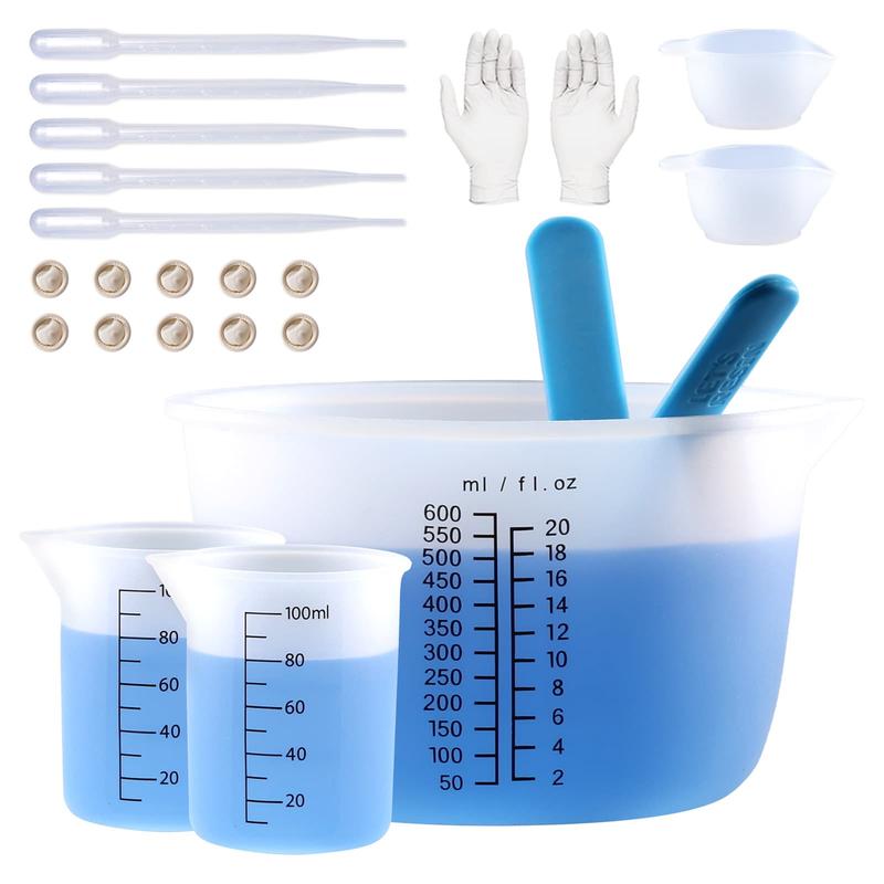·Great Value Resin Mixing Kit: This set includes 1 pcs 600ml (20oz) large capacity silicone measuring bowl with dual scales, 2 pcs 100ml silicone mixing cups, 2 pcs silicone resin cups, 2 pcs silicone stirring stick, 10 pcs finger cots, 5 pcs pipettes, and 2 pcs gloves. The silicone cups are reusable, offering a higher cost-effectiveness compared to disposable epoxy mixing cups.