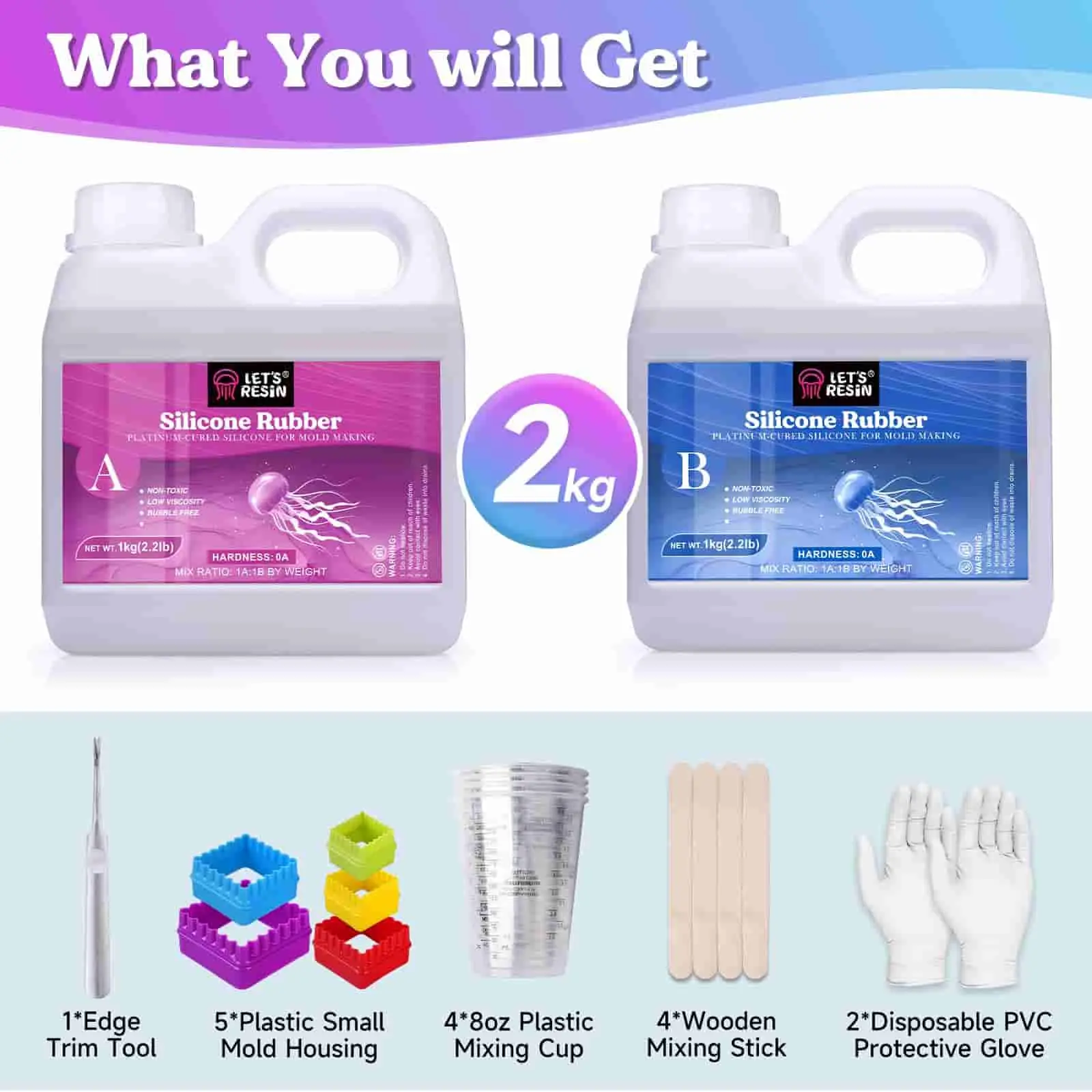 ·【70.5OZ ALL IN ONE MOLD MAKING KIT】: LETS RESIN silicone mold making kit comes with 2 bottles of liquid silicone rubber, each bottle containing 1kg/2.2 lbs casting silicone, as well as 5 x different size plastic mold housing; 4 x 8oz plastic mixing cups; 4 x wooden mixing sticks; 2 pairs x disposable protective gloves; a perfect mold maing kit for beginners to try, satisfying your various needs.