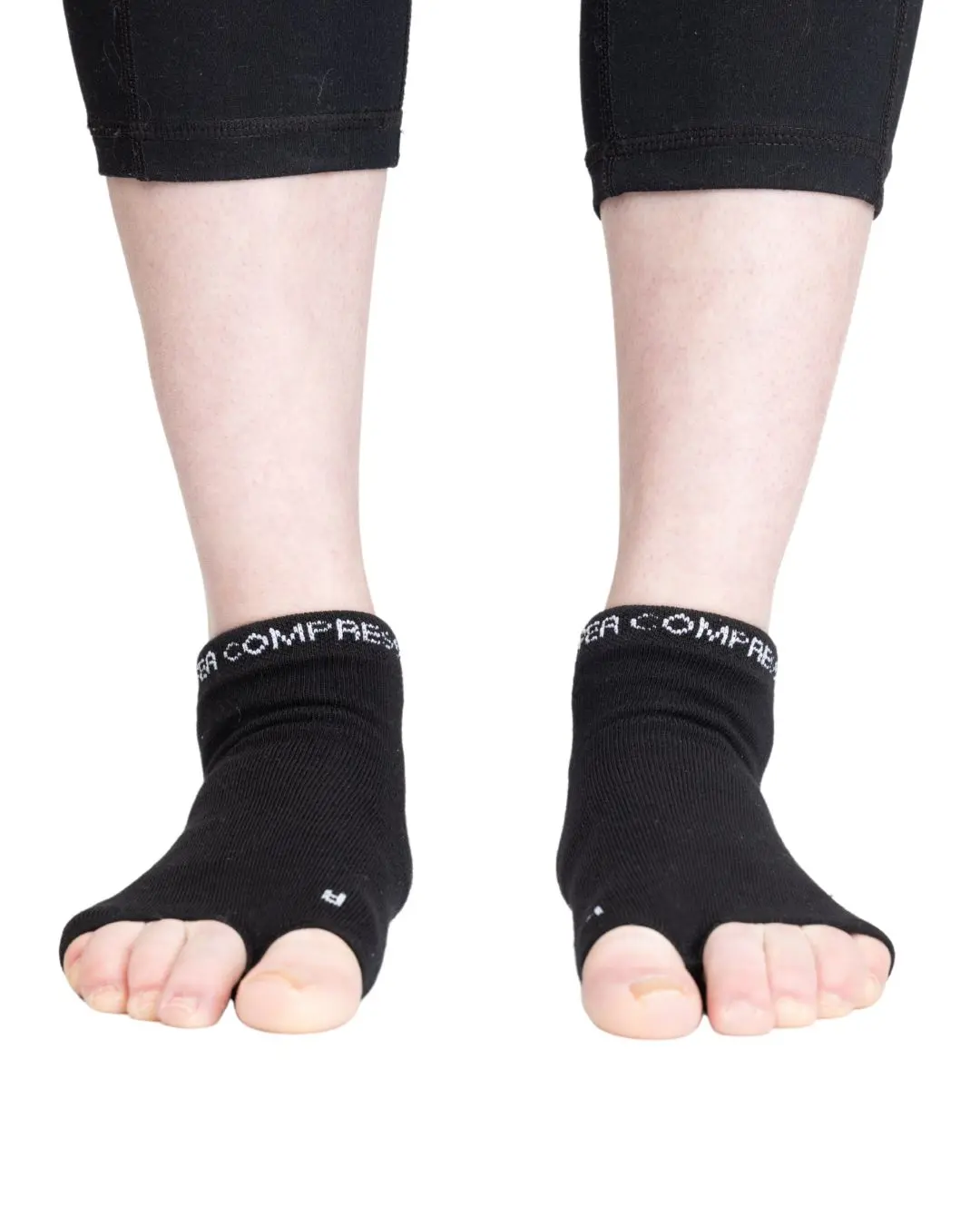 Feel grounded and supported in every move with these copper-infused grip socks, designed for ultimate comfort, stability, and foot relief. A split-toe design helps align your feet while soft silicone grips prevent slipping during yoga, barre, pilates, or everyday wear. Breathable, moisture-wicking fabric keeps your feet cool and dry, while copper helps fight odor and support skin health.
