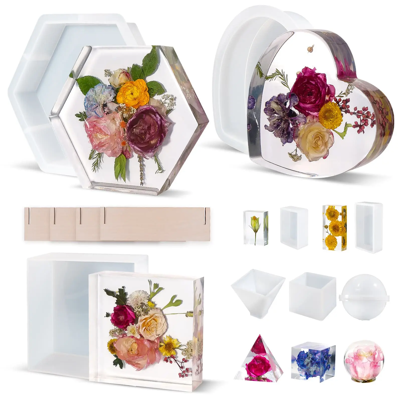 ·【Package Include】This resin molds set contains 3pcs large resin molds with hexagon mold, heart mold ,square resin mold with wooden support, as well as 5pcs small resin molds with sphere, cube, pyramid, rectangle shape, which can greatly meet your various creation needs.(NOTE: Resin and Flowers are not included)
