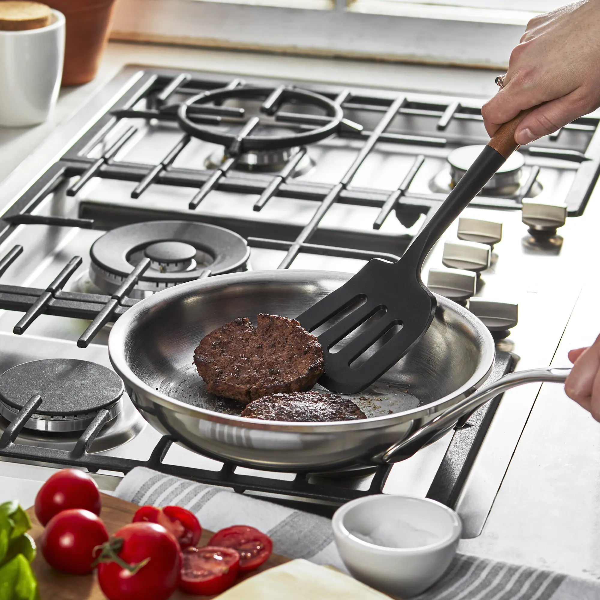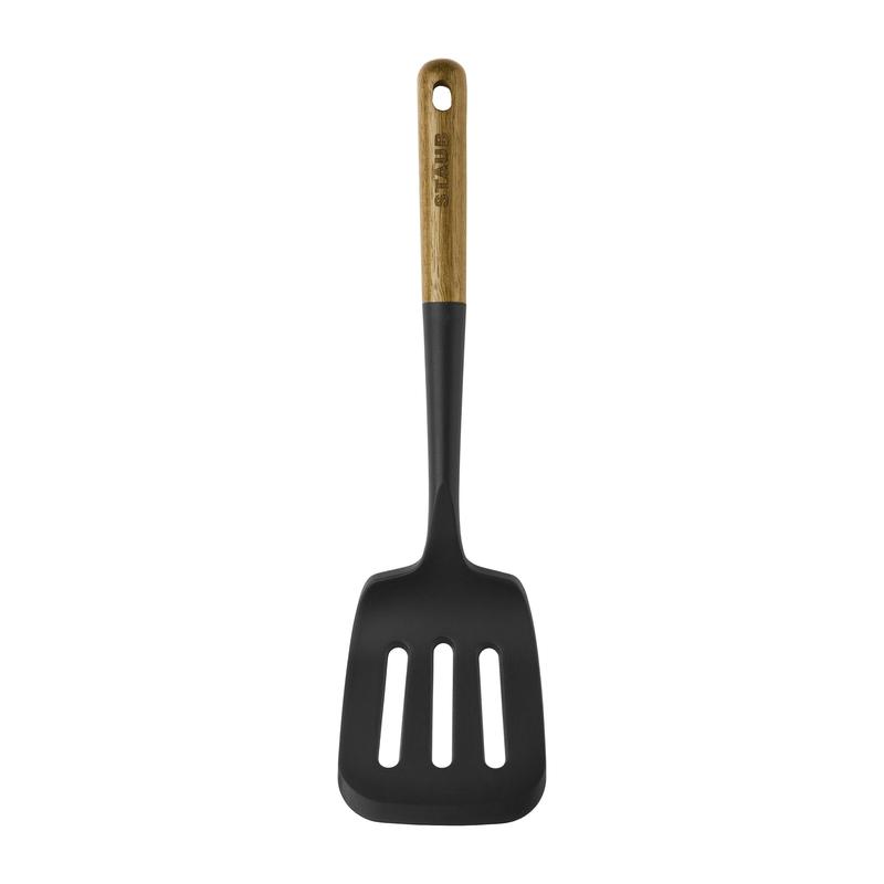 This silicone serving turner is perfectly angled for lifting sandwiches and picking up veggies from a sheet tray. Thanks to the handy slots that strain grease away, you can serve juicy burgers and bacon with no mess. STAUB silicone tools make the perfect registry or hostess gift for newlyweds, new homeowners, or the long-time STAUB fan.