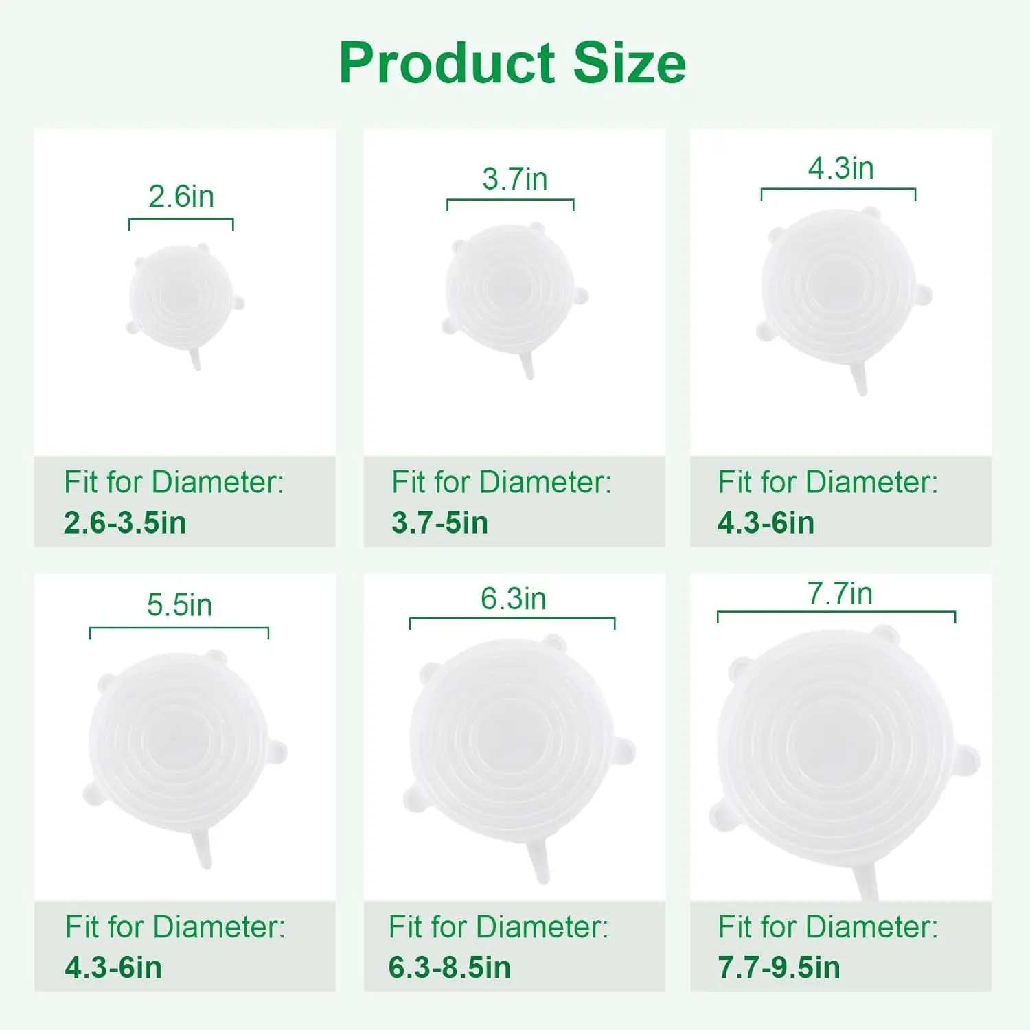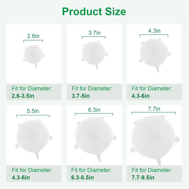 Made of durable silicone, these lids are washable and endlessly reusable—a sustainable alternative to plastic wrap or foil. Doubles as jar openers or anti-slip coasters. Strong grip provides friction to open tight lids with ease. 6 Versatile Sizes in One Set: Includes 6 lid sizes: 2.6in, 3.7in, 4.3in, 5.5in, 6.3in, 7.7in – covering everything from jars to large salad bowls.