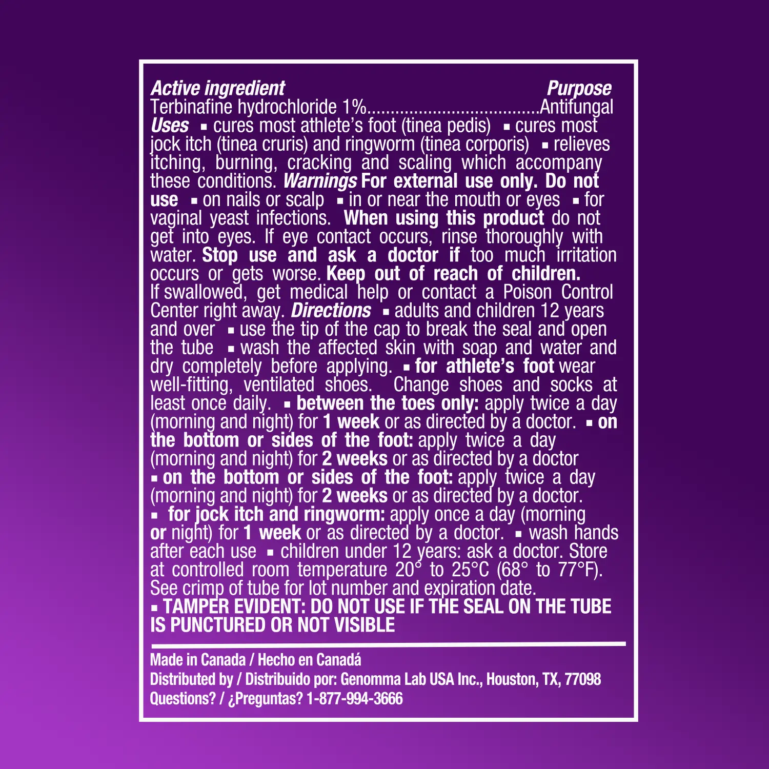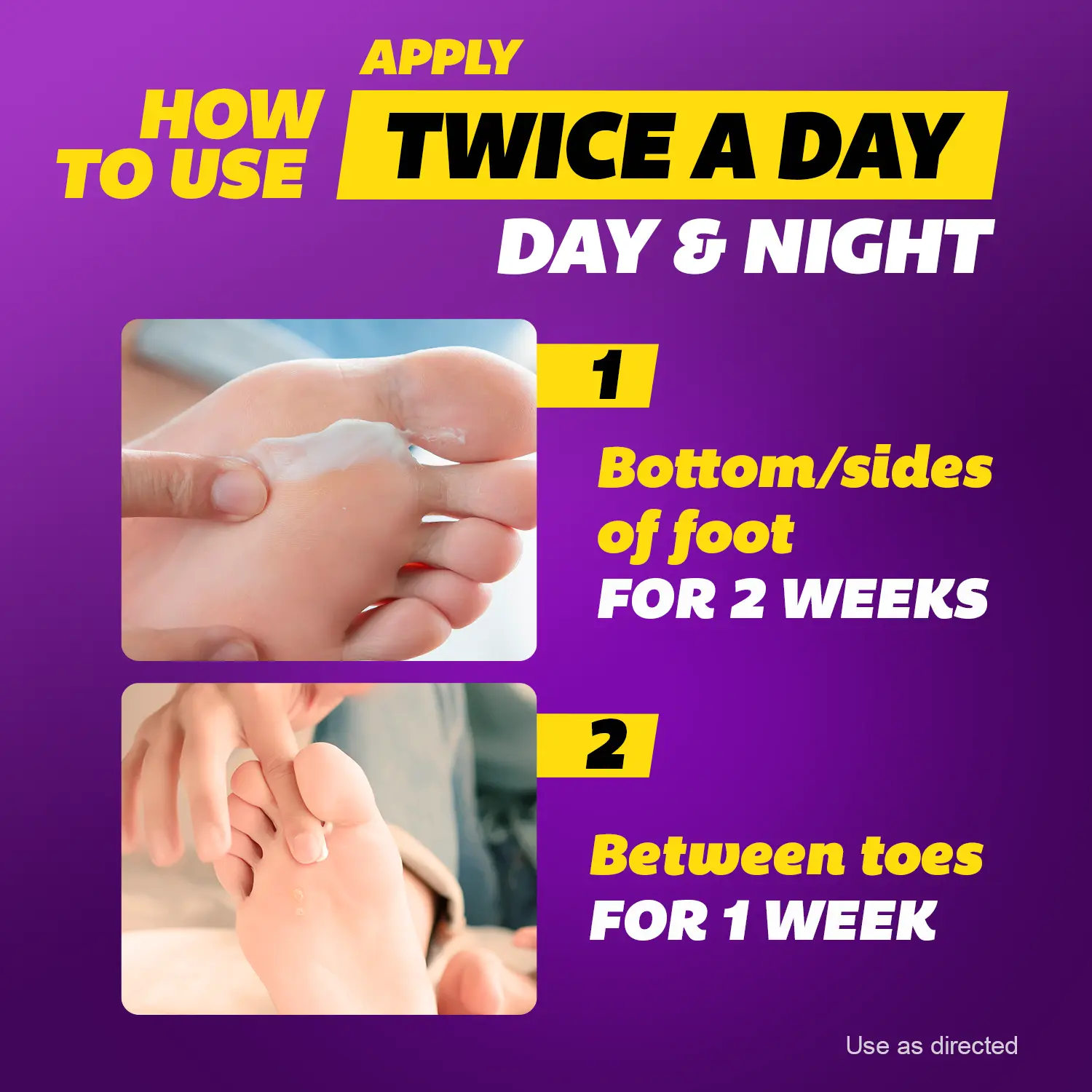 ·Application: Wash affected skin with soap, and water and dry fully before applying. Between the toes, apply twice a day for 1 week. On the bottom or sides of the foot, apply twice a day for 2 weeks. For jock itch and ringworm, apply once a day for 1 week