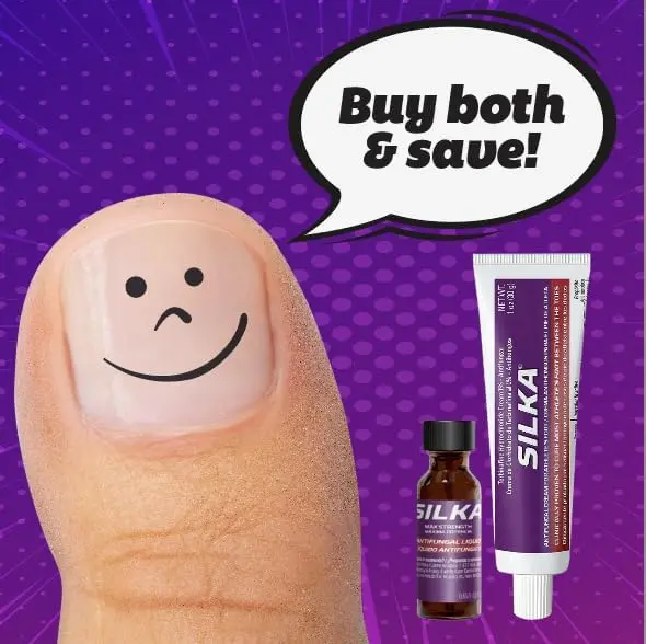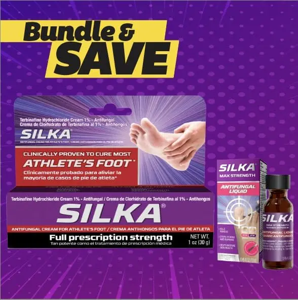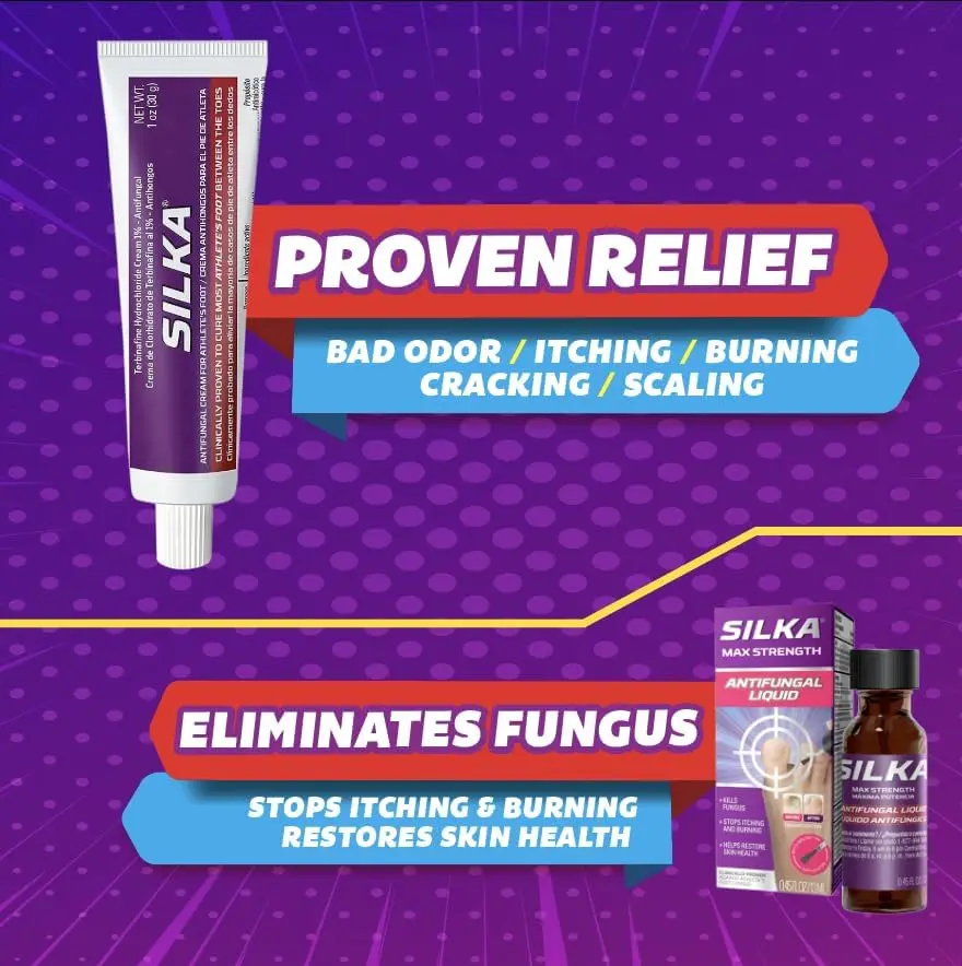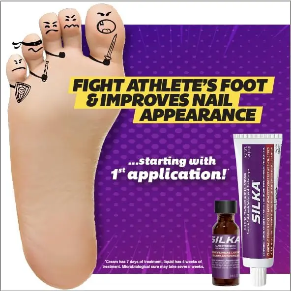 Experience the Silka Max Strength Antifungal Liquid & Cream Set. This set combats toenail fungus, athlete's foot, ringworm, itch, and burning sensations. It effectively treats toenail fungus and provides relief for athlete's foot and ringworm. The set soothes itch and burning sensations with its soothing agents like menthol and emollients. Alcohol-free and suitable for all age groups.