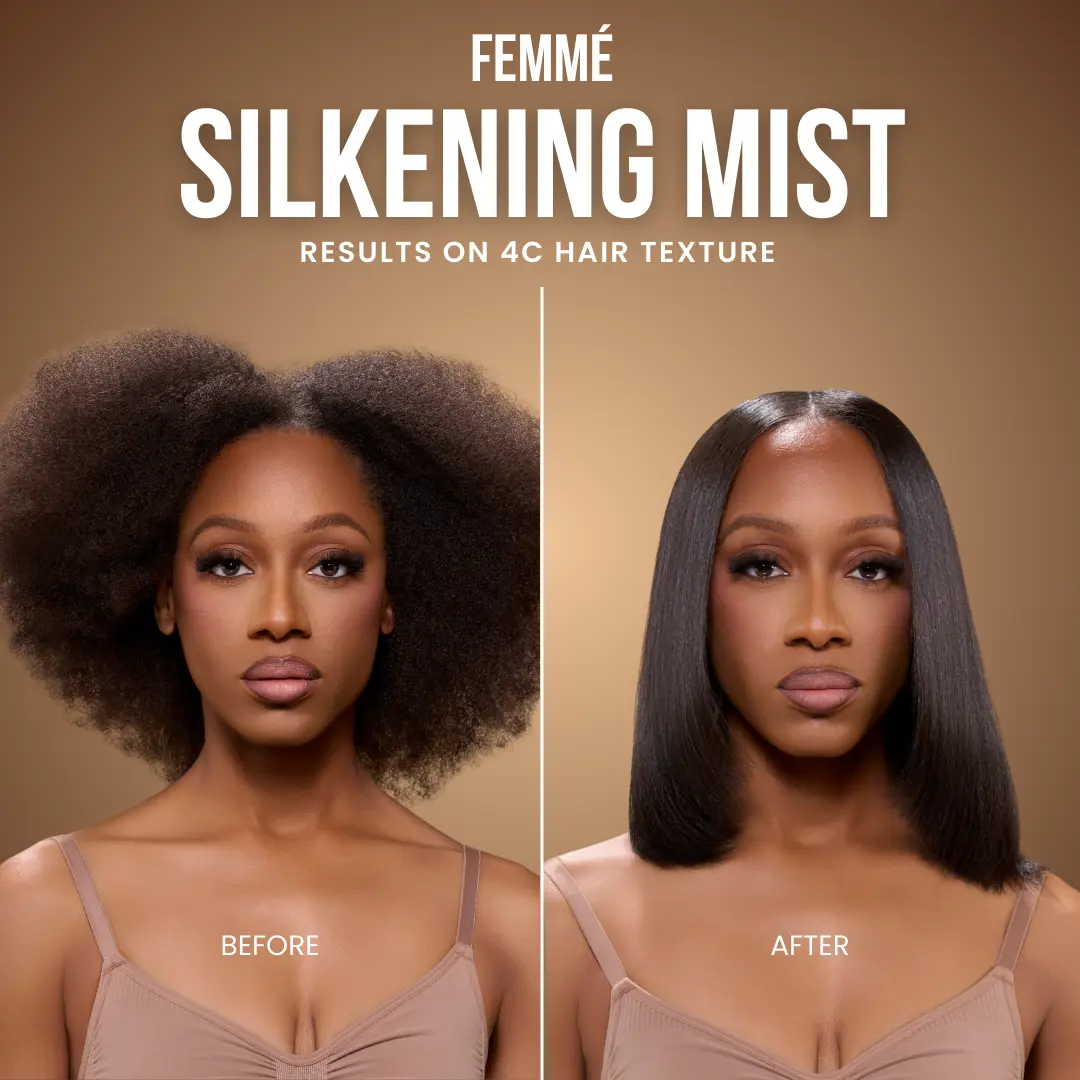 Take your silk press to the next level with Femmé Hair Care Silkening Mist—the ultimate straightening enhancer. This weightless mist boosts shine, tames flyaways, and helps you achieve bone-straight, silky perfection with every press. Perfect for natural hair and extensions, it’s the finishing touch your hair routine needs.
