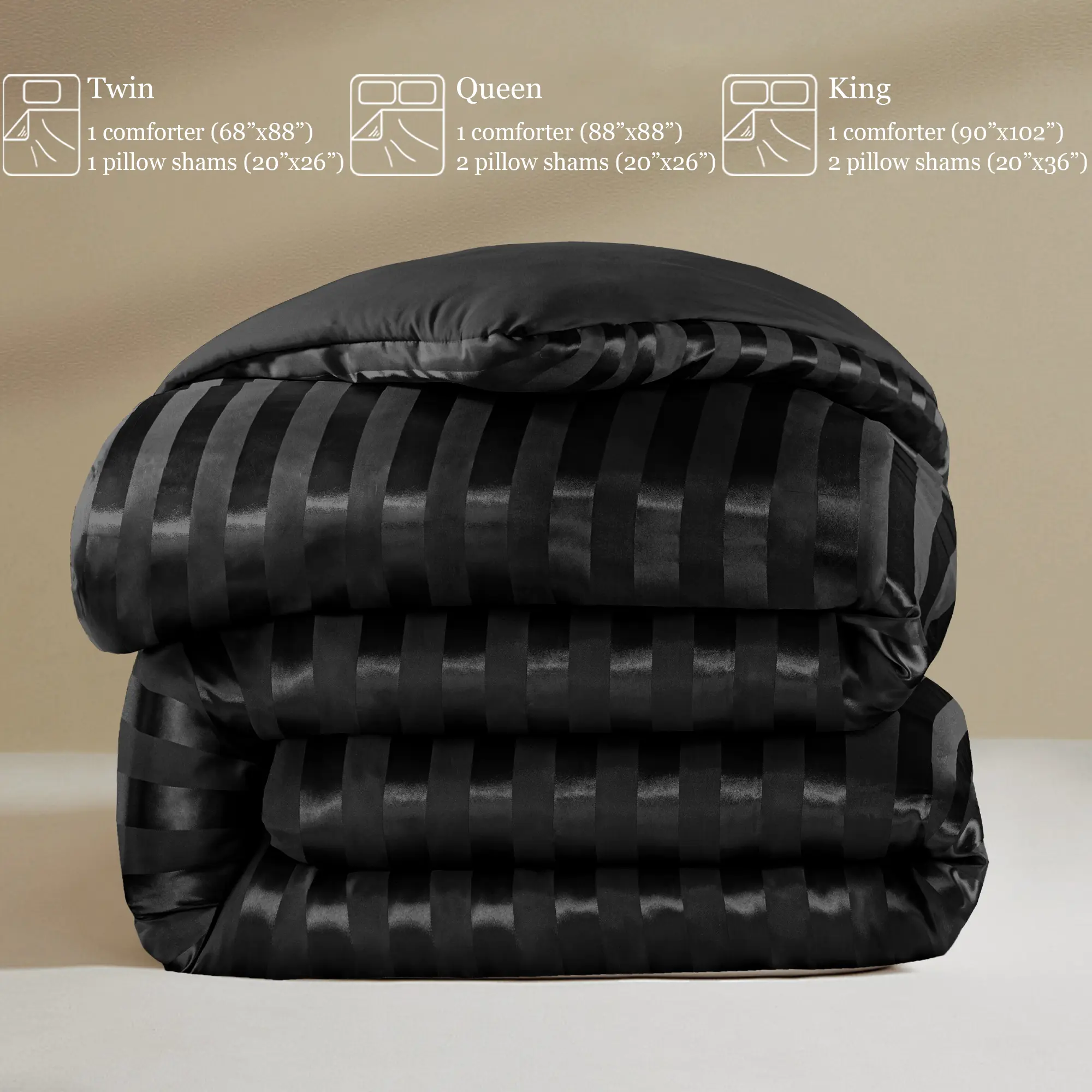 Package include: The king comforter set includes a stripe satin comforter (90"x102"), and two king satin pillowcases (20"x36"). The queen comforter set includes a stripe satin comforter (88"X88"), and two standard satin pillowcases (20"x26"). The twin comforter set includes a stripe satin comforter (68"X88"), and a standard satin pillowcase (20"x26"). There are always ones you would like or goes well with comforter